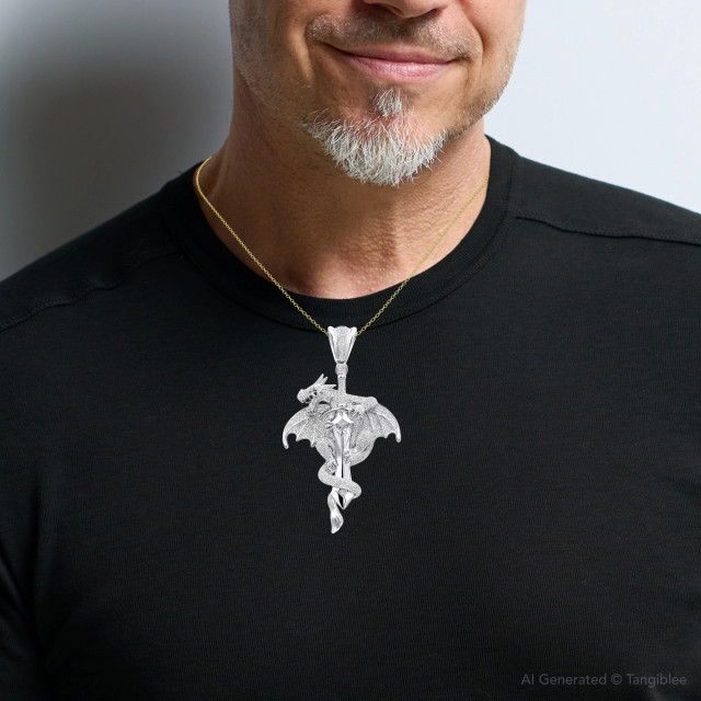 10K Gold Diamond Dragon on a Sword Pendant for Men | Animal | 7.25ct