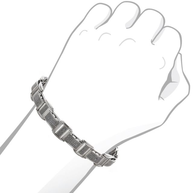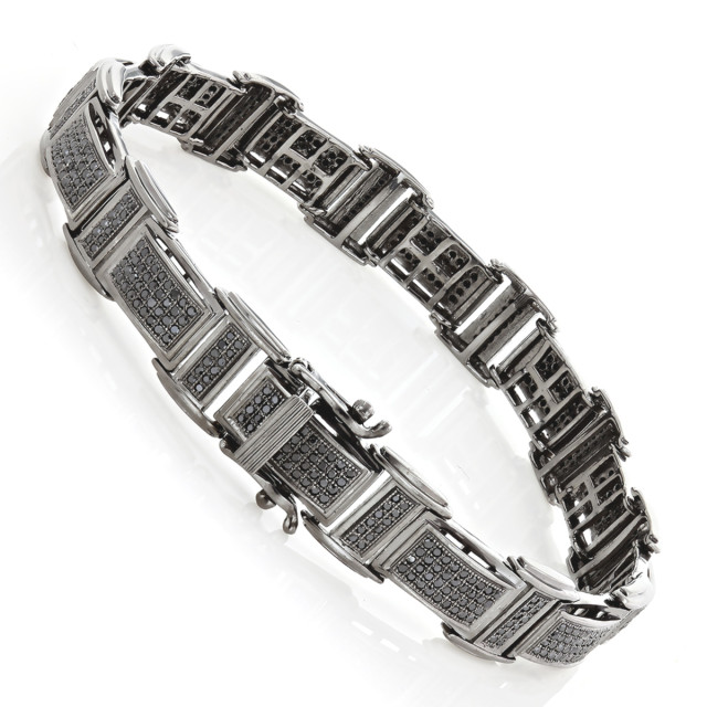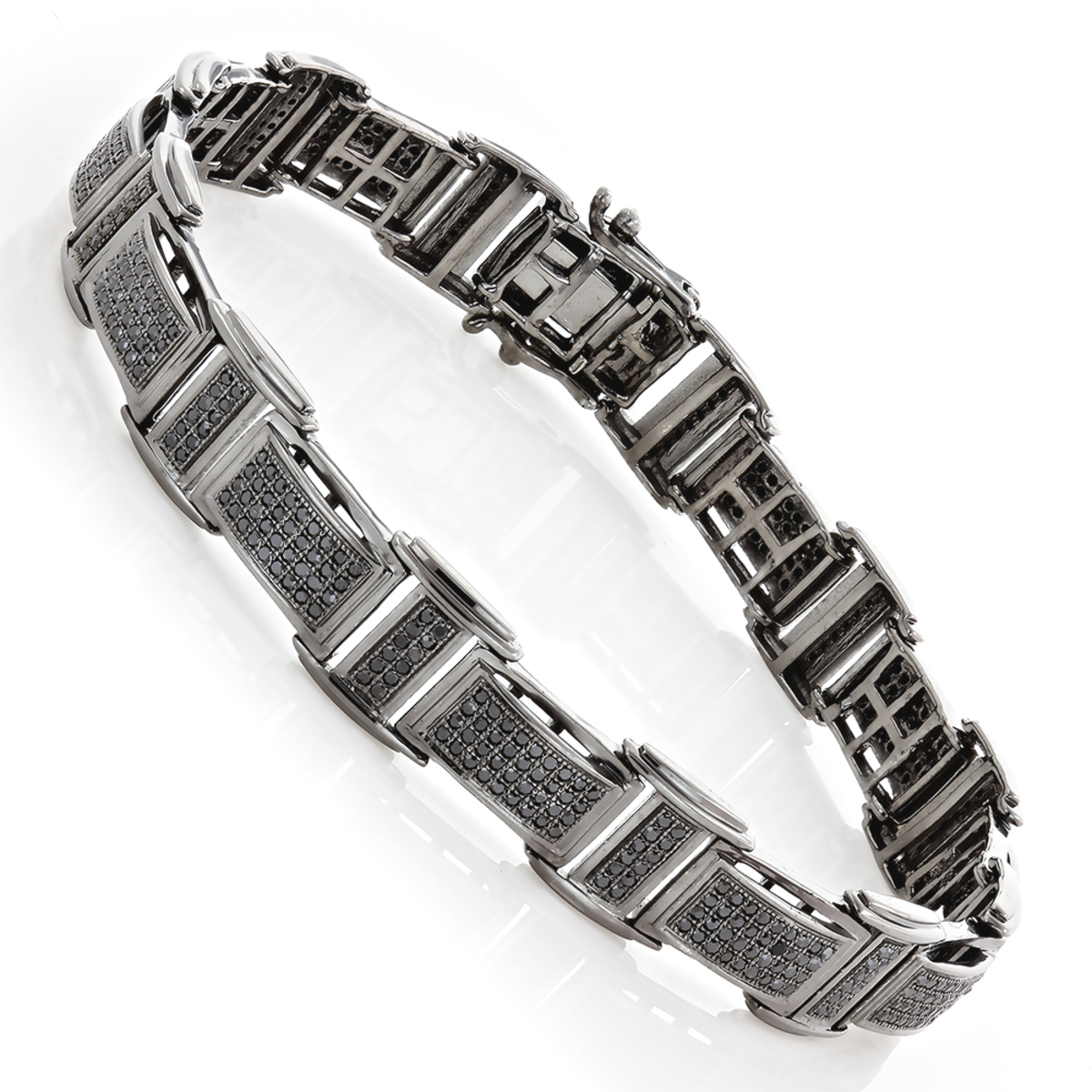 This Men's Diamond bracelet is made from 14k Gold, weighing 29 grams and is 10 mm wide and length inches. This Men's Diamond bracelet features 1.75 carats of Black Diamonds, showcasing a chain and is available in 14k white gold, yellow gold and rose gold as well as 18k gold and platinum as a custom order.