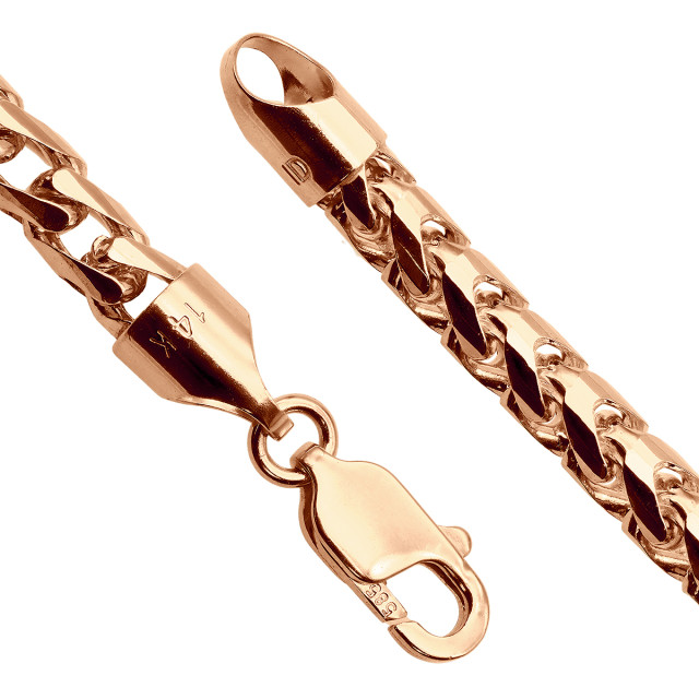 This Women's Chain Necklace feature a Lobster Claw clasp. Made from 14k Rose Gold with a Franco link type and Solid fitting. This Chain Necklace measures 16 inches in length and 2 mm in width. It color diamonds and a Diamond Cut design. It is also available in 14k white gold, yellow gold and rose gold as well as 18k gold and platinum as a custom order.