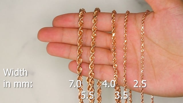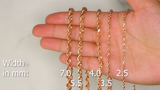 This Men's Chain feature a Lobster Claw clasp. Made from 14k Rose Gold with a Rope link type and Solid fitting. This Chain measures 20 inches in length and 3 mm in width. It color diamonds and a Diamond Cut design. It is also available in 14k white gold, yellow gold and rose gold as well as 18k gold and platinum as a custom order.