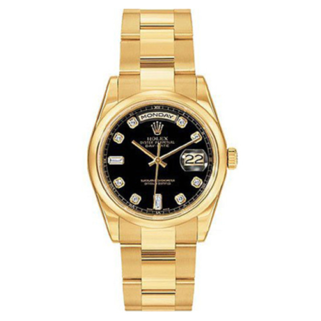 This Men's Business Rolex Day-Date. The watch is made of 18k Gold, offering a premium feel. The case measures 36 mm, It a Oyster style bracelet for a comfortable fit. The dial is Black, and comes with a seller's warranty of months. Also available on custom order with additional options. These pre-owned Rolex watches are authentic Rolex watches with genuine diamonds, in excellent condition, they are checked for authenticity and basic water resistance. Watches will withstand an occasional rain just fine, but they are not diver's watches and should not be worn in shower or while swimming.