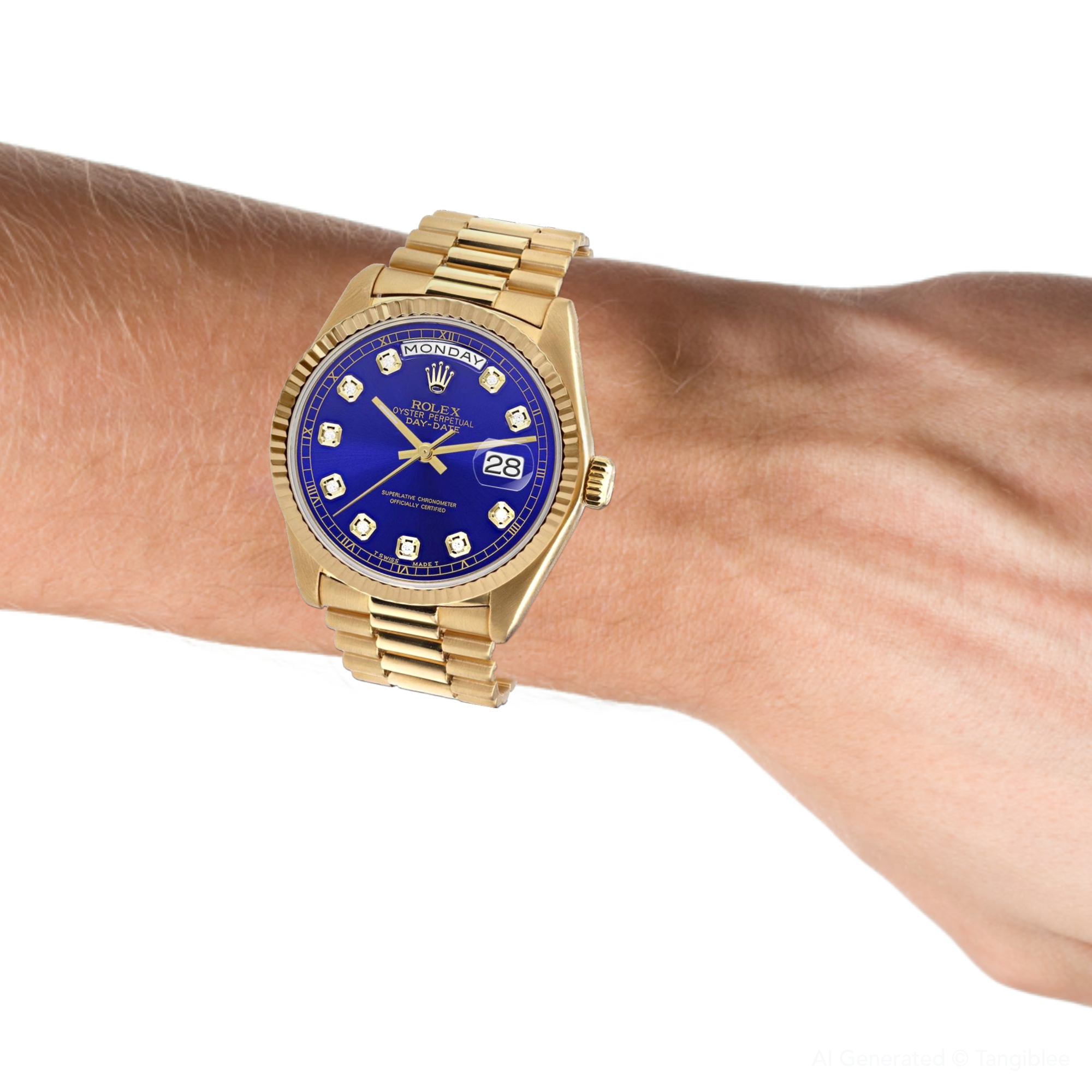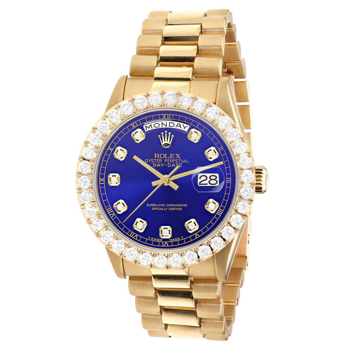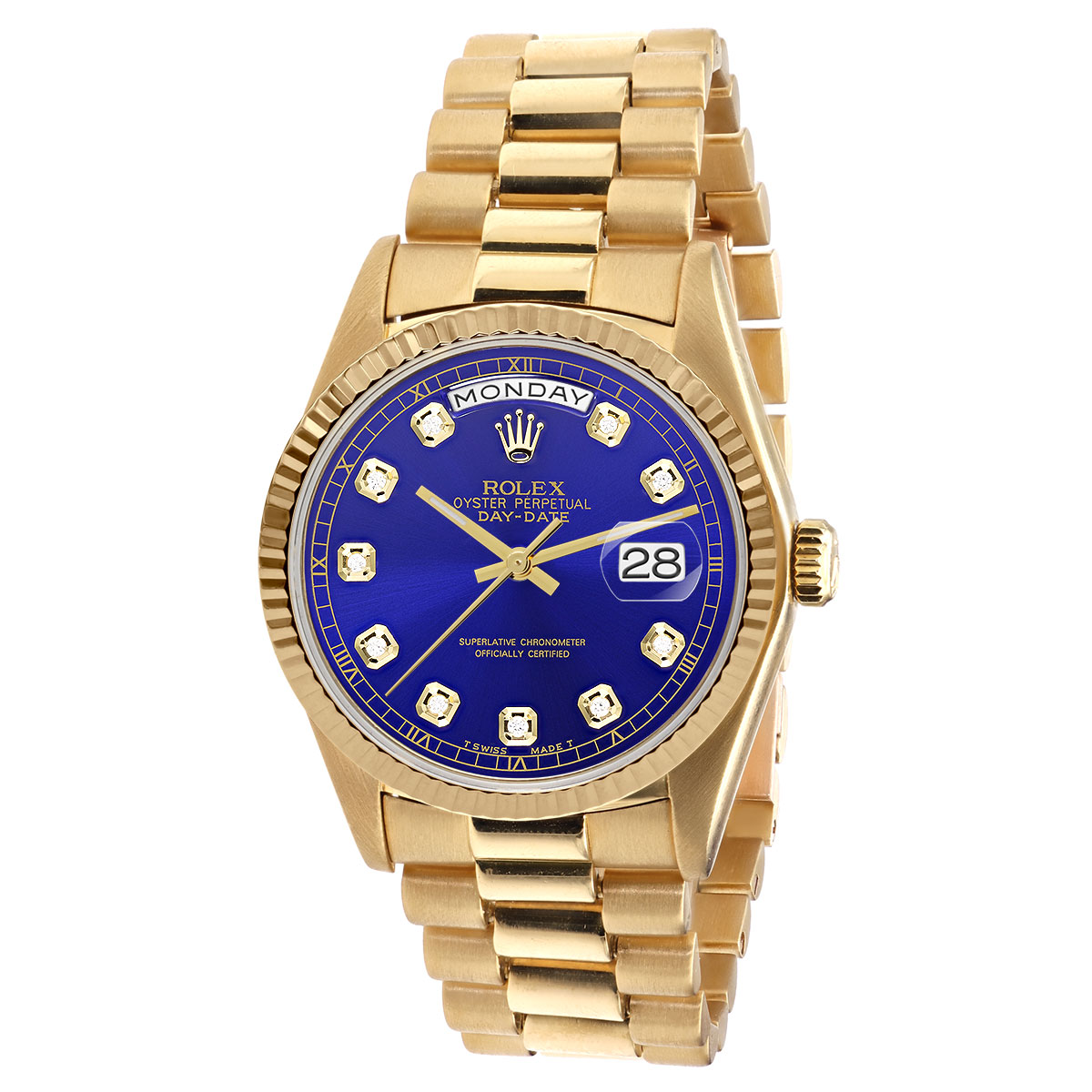 This Men's Rolex Day-Date is a luxurious and stylish watch. It features a Yellow color scheme, adding sophistication to its design. The watch is made of 18k Gold, offering a premium feel. The case measures 36 mm. The case is crafted from 18k Gold. The bracelet is made of Yellow Gold It features a President style bracelet for a comfortable fit. The bezel is made of Yellow Gold. The dial is Blue, enhancing its visual appeal. Powered by an Automatic movement, the watch includes functions such as Date Indicator. Offered in Very Good condition, and comes with a seller's warranty of 60 months. Also available on custom order with additional options. These pre-owned Rolex watches are authentic Rolex watches with genuine diamonds, in excellent condition, they are checked for authenticity and basic water resistance. Watches will withstand an occasional rain just fine, but they are not diver's watches and should not be worn in shower or while swimming.