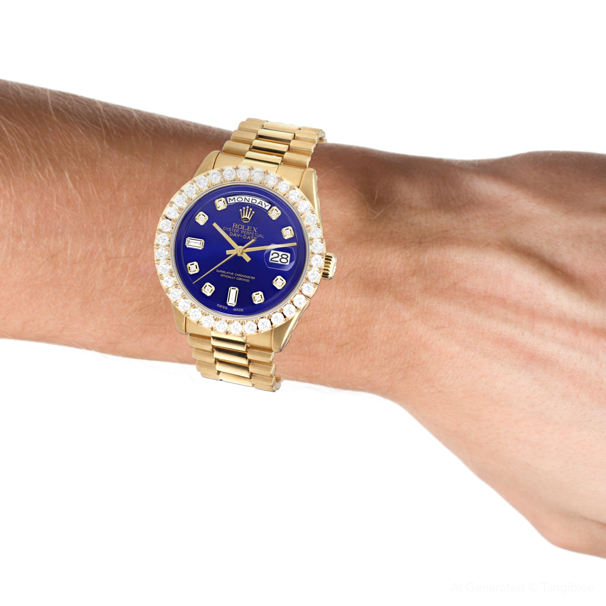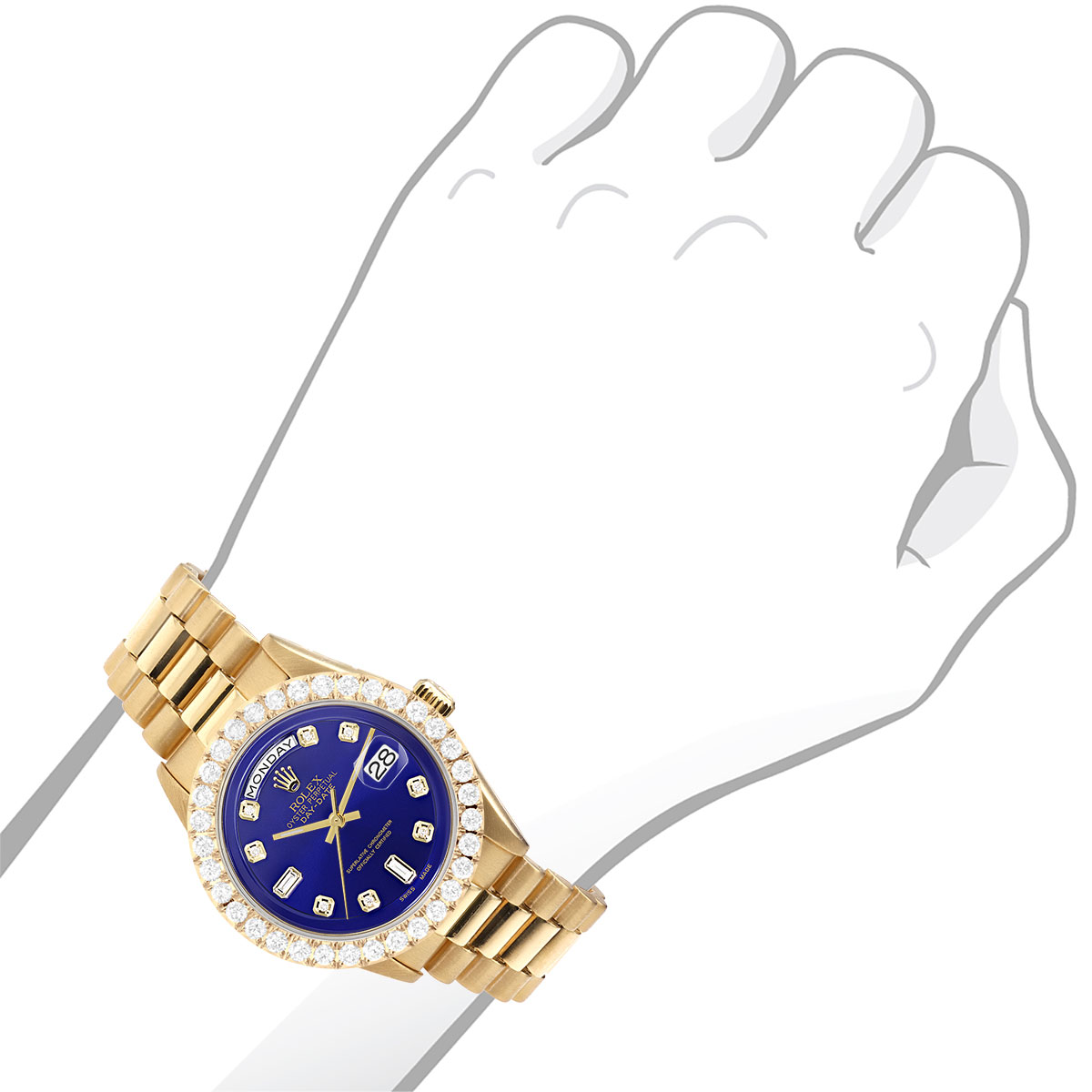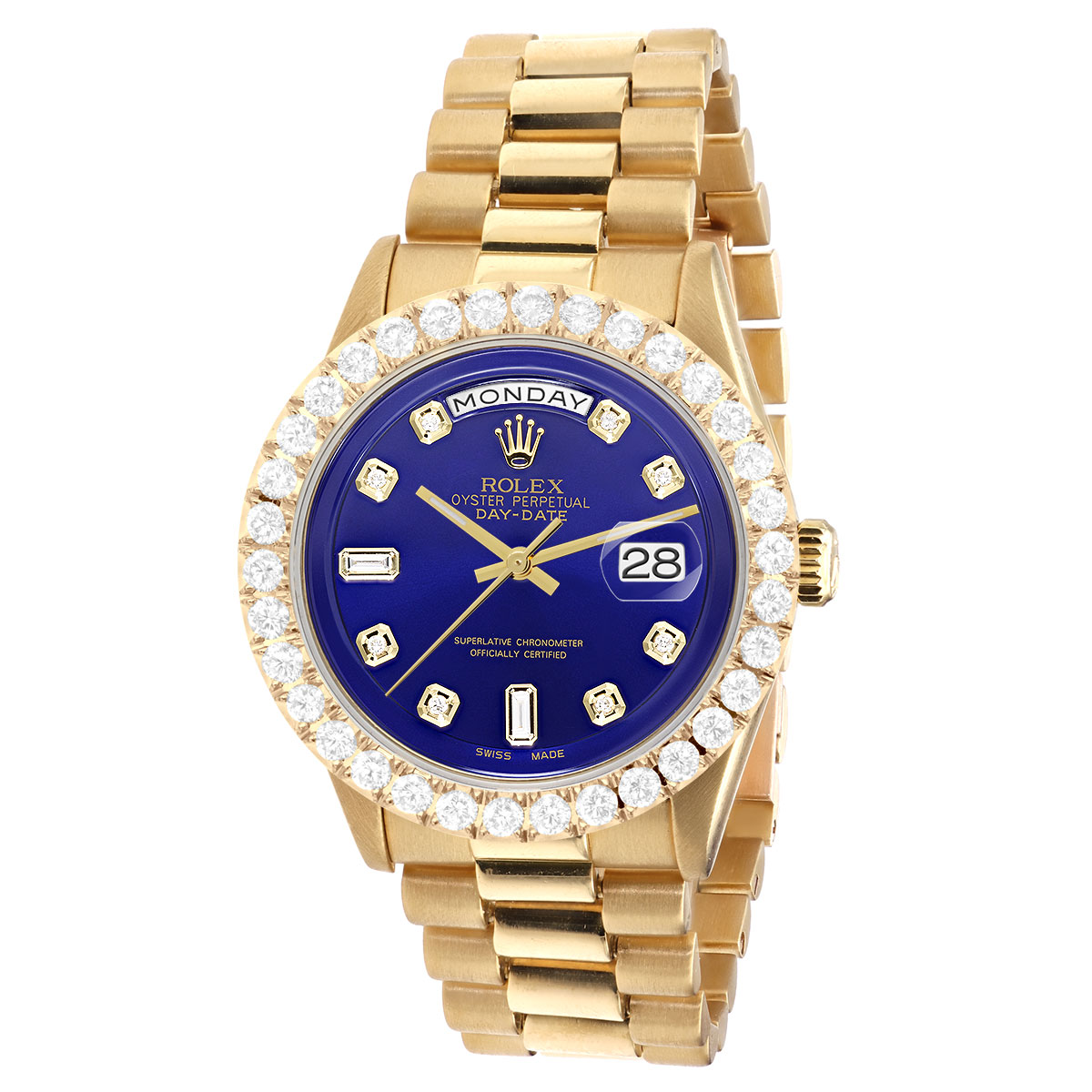 This Men's Rolex Day-Date is a luxurious and stylish watch. It features a Yellow color scheme, adding sophistication to its design. The watch is made of 18k Gold, offering a premium feel. The case measures 36 mm. The case is crafted from 18k Gold. The bracelet is made of Yellow Gold It features a President style bracelet for a comfortable fit. The bezel is made of Yellow Gold and is set with White Diamonds. The dial is Blue, enhancing its visual appeal. Powered by an Automatic movement, the watch includes functions such as Date Indicator. Offered in Very Good condition, and comes with a seller's warranty of 60 months. Also available on custom order with additional options. These pre-owned Rolex watches are authentic Rolex watches with genuine diamonds, in excellent condition, they are checked for authenticity and basic water resistance. Watches will withstand an occasional rain just fine, but they are not diver's watches and should not be worn in shower or while swimming.