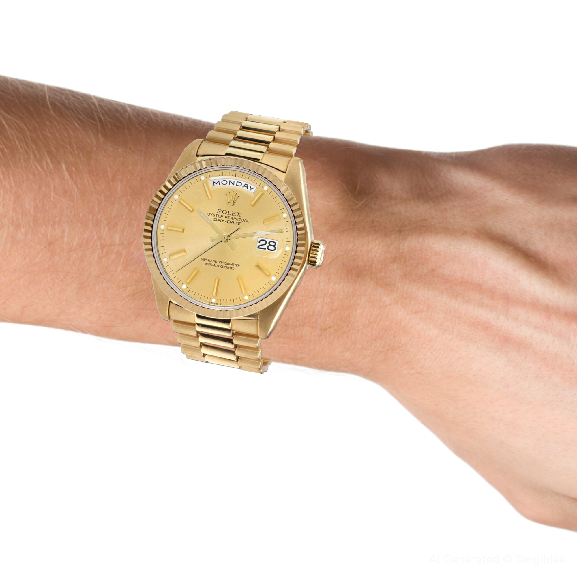 This Men's Rolex Day-Date is a luxurious and stylish watch. It features a Yellow color scheme, adding sophistication to its design. The watch is made of 18k Gold, offering a premium feel. The case measures 36 mm. The case is crafted from 18k Gold. The bracelet is made of Yellow Gold It features a President style bracelet for a comfortable fit. The bezel is made of Yellow Gold. The dial is Gold Tone, enhancing its visual appeal. Powered by an Automatic movement, the watch includes functions such as Date Indicator. Offered in Very Good condition, and comes with a seller's warranty of 60 months. Also available on custom order with additional options. These pre-owned Rolex watches are authentic Rolex watches with genuine diamonds, in excellent condition, they are checked for authenticity and basic water resistance. Watches will withstand an occasional rain just fine, but they are not diver's watches and should not be worn in shower or while swimming.
