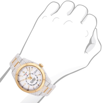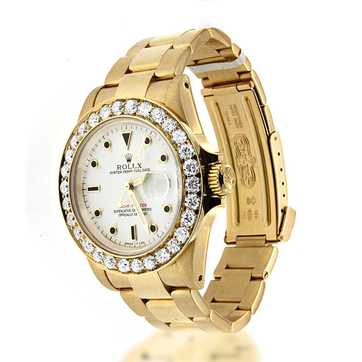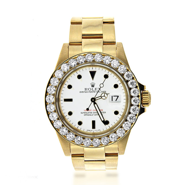 This Men's Rolex Yacht-Master is a luxurious and stylish watch. The watch is made of 18k Gold, offering a premium feel. The case measures 40 mm. The case is crafted from 18k Gold. The bracelet is made of Yellow Gold It features an Oyster style bracelet for a comfortable fit. The bezel is made of Yellow Gold and is set with White Diamonds. The dial is White, enhancing its visual appeal. Powered by an Automatic movement, the watch includes functions such as Date Indicator. Offered in Very Good condition, and comes with a seller's warranty of 60 months. Also available on custom order with additional options. These pre-owned Rolex watches are authentic Rolex watches with genuine diamonds, in excellent condition, they are checked for authenticity and basic water resistance. Watches will withstand an occasional rain just fine, but they are not diver's watches and should not be worn in shower or while swimming.