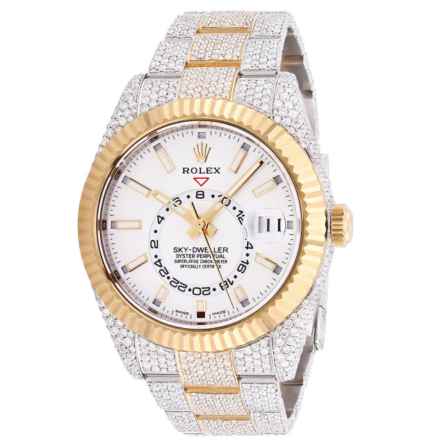 This Men's Bust Down Rolex Sky-Dweller is a luxurious and stylish watch. The watch is made of 18k Gold/Stainless Steel, offering a premium feel. The case measures 41 mm. The case is adorned with White Diamonds, enhancing its elegance. The bracelet is made of Yellow Gold and is set with White Diamonds. It features an Oyster style bracelet for a comfortable fit. The bezel is made of Yellow Gold. The dial is White, enhancing its visual appeal. Powered by an Automatic movement, the watch includes functions such as Date Indicator. Offered in Very Good condition, and comes with a seller's warranty of 60 months. Also available on custom order with additional options. These pre-owned Rolex watches are authentic Rolex watches with genuine diamonds, in excellent condition, they are checked for authenticity and basic water resistance. Watches will withstand an occasional rain just fine, but they are not diver's watches and should not be worn in shower or while swimming.