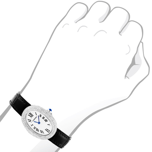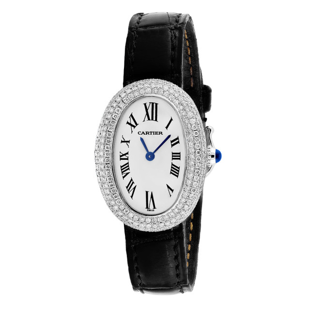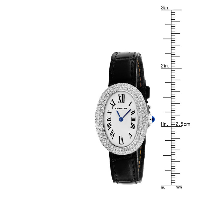 This Women's Cartier Baignoire is a luxurious and stylish watch. The watch is made of 18k Gold, offering a premium feel. The case measures 22 mm. The case is crafted from 18k Gold. The bracelet is made of Black Genuine Leather. The bezel is made of Gold and is set with White. The dial is White, enhancing its visual appeal. Powered by a Swiss-Quartz movement. Offered in Good condition, and comes with a seller's warranty of 60 months. Also available on custom order with additional options. Please note this Cartier watch is pre-owned, in excellent condition, the diamonds are high quality, natural diamonds, set by our master craftsmen, watch box might show signs of wear (watch itself will be in perfect condition), comes with a 5 year warranty from ItsHot.