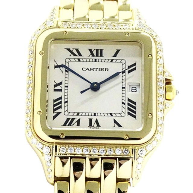 This Women's Cartier Panthere is a luxurious and stylish watch. The watch is made of 18k Gold, offering a premium feel. The case measures 27 mm. The case is crafted from 18k Gold. The case is adorned with Diamonds, enhancing its elegance. The bracelet is made of Yellow Gold. The bezel is made of Yellow Gold. The dial is Cream, enhancing its visual appeal. Powered by a Quartz movement, the watch includes functions such as Date Indicator. Offered in Very Good condition, and comes with a seller's warranty of 60 months. Also available on custom order with additional options.