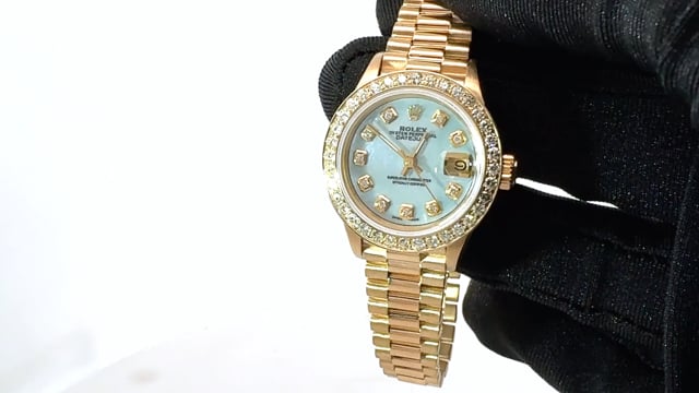 This Women's Rolex Datejust is a luxurious and stylish watch. It features a Yellow color scheme, adding sophistication to its design. The watch is made of 18k Gold, offering a premium feel. The case measures 26 mm. The case is crafted from 18k Gold. The bracelet is made of Yellow Gold It features a President style bracelet for a comfortable fit. The bezel is made of Yellow Gold and is set with Diamonds. The dial is Blue, enhancing its visual appeal. Powered by an Automatic movement. Offered in Very Good condition, and comes with a seller's warranty of 60 months. Also available on custom order with additional options. These pre-owned Rolex watches are authentic Rolex watches with genuine diamonds, in excellent condition, they are checked for authenticity and basic water resistance. Watches will withstand an occasional rain just fine, but they are not diver's watches and should not be worn in shower or while swimming.