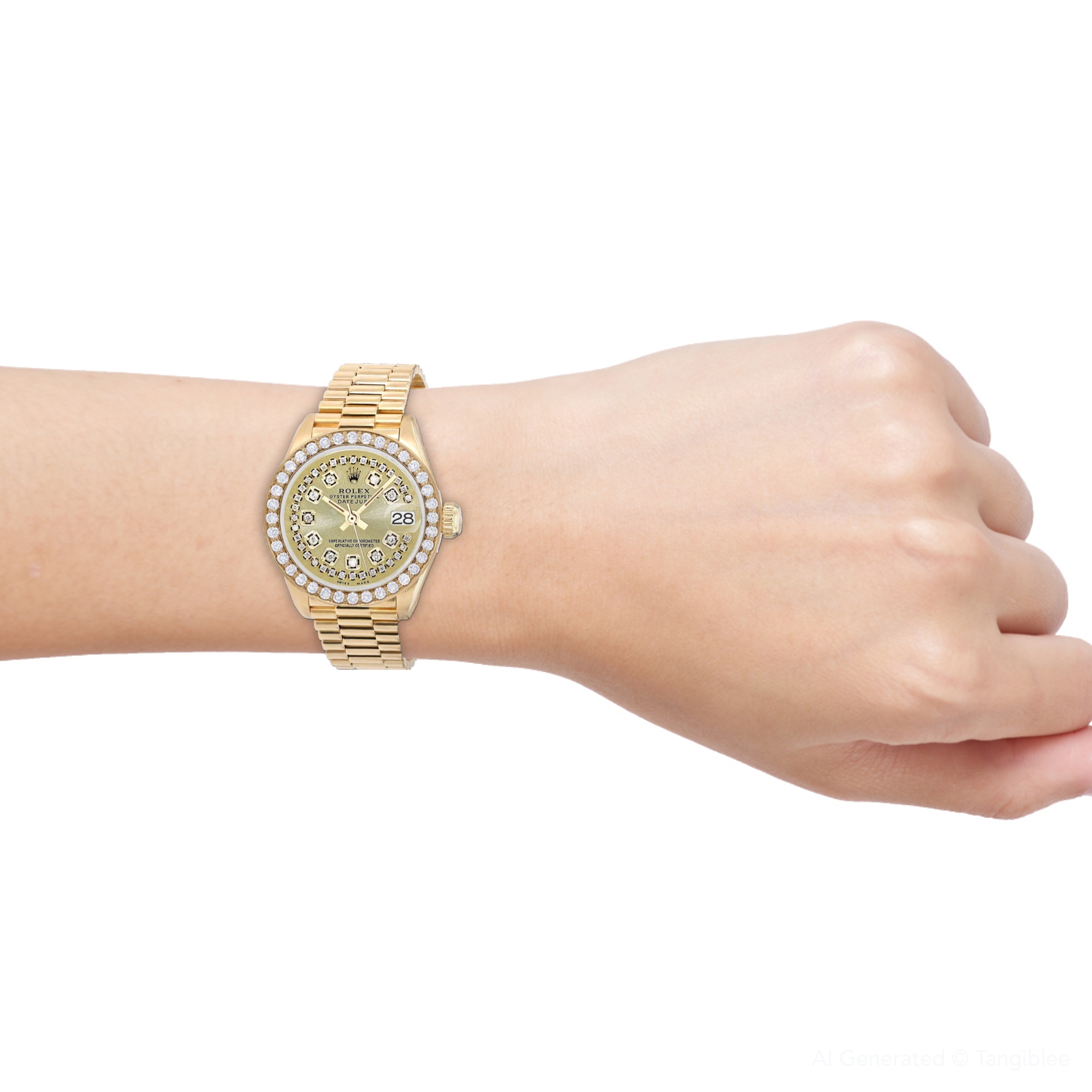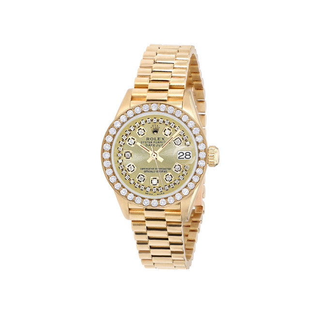 This Women's Rolex Datejust is a luxurious and stylish watch. It features a Yellow color scheme, adding sophistication to its design. The watch is made of 18k Gold, offering a premium feel. The case measures 26 mm. The case is crafted from 18k Gold. The bracelet is made of Yellow Gold It features a President style bracelet for a comfortable fit. The bezel is made of Yellow Gold and is set with White Diamonds. The dial is Champagne, enhancing its visual appeal. Powered by an Automatic movement. Offered in Good condition, and comes with a seller's warranty of 60 months. Also available on custom order with additional options. These pre-owned Rolex watches are authentic Rolex watches with genuine diamonds, in excellent condition, they are checked for authenticity and basic water resistance. Watches will withstand an occasional rain just fine, but they are not diver's watches and should not be worn in shower or while swimming.