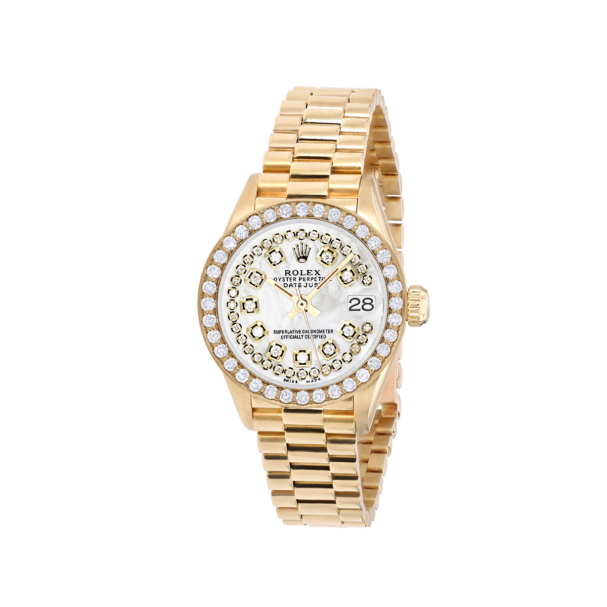 This Women's Rolex Datejust is a luxurious and stylish watch. It features a Yellow color scheme, adding sophistication to its design. The watch is made of 18k Gold, offering a premium feel. The case measures 26 mm. The case is crafted from 18k Gold. The bracelet is made of Yellow Gold It features a President style bracelet for a comfortable fit. The bezel is made of Yellow Gold and is set with Diamonds. The dial is White, enhancing its visual appeal. Powered by an Automatic movement. Offered in Very Good condition, and comes with a seller's warranty of 60 months. Also available on custom order with additional options. These pre-owned Rolex watches are authentic Rolex watches with genuine diamonds, in excellent condition, they are checked for authenticity and basic water resistance. Watches will withstand an occasional rain just fine, but they are not diver's watches and should not be worn in shower or while swimming.
