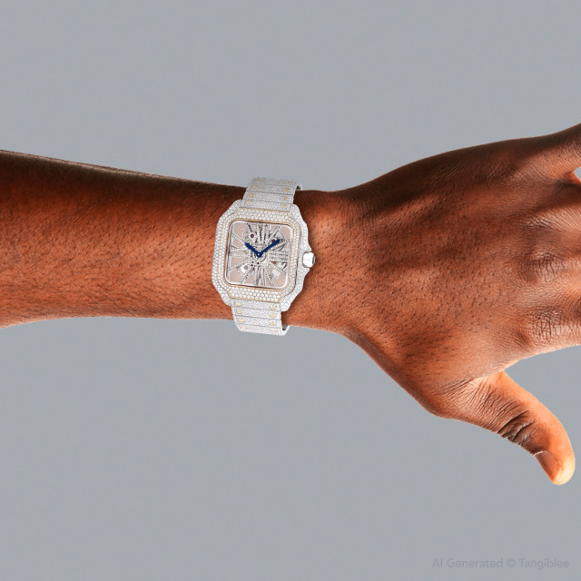 This Men's and Women's Bust Down Cartier Santos de Cartier is a luxurious and stylish watch. It features a White/Yellow color scheme, adding sophistication to its design. The watch is made of Gold/Stainless Steel, offering a premium feel. The case measures 40 mm. The case is adorned with White Diamonds, enhancing its elegance. The bracelet is made of White Stainless Steel and is set with White Diamonds. The bezel is made of Yellow Gold and is set with White Diamonds. enhancing its visual appeal. Offered in Very Good condition, and comes with a seller's warranty of 60 months. Also available on custom order with additional options. Please note this Cartier watch is pre-owned, in excellent condition, the diamonds are high quality, natural diamonds, set by our master craftsmen, watch box might show signs of wear (watch itself will be in perfect condition), comes with a 5 year warranty from ItsHot.