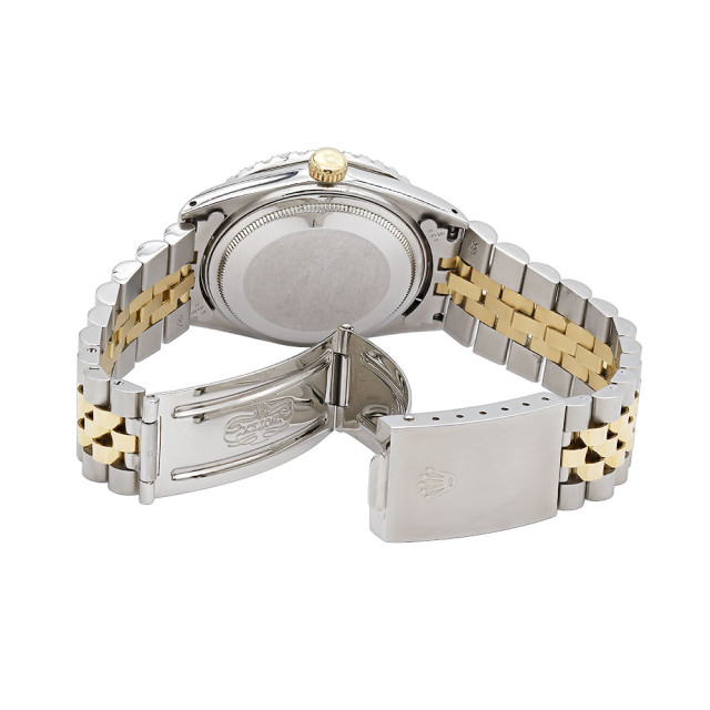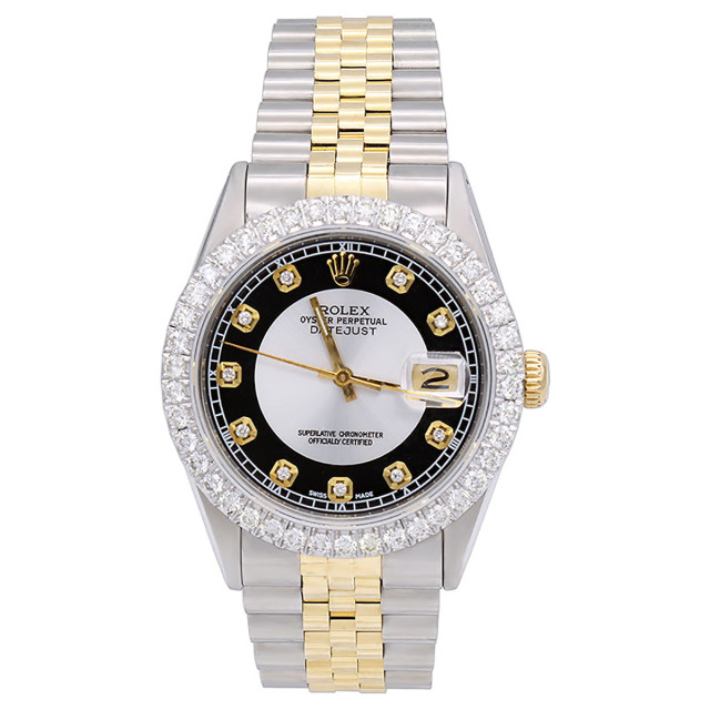 This Men's Two-Tone Rolex Datejust is a luxurious and stylish watch. The watch is made of Gold/Stainless Steel, offering a premium feel. The case measures 36 mm. The bracelet is made of Gold/Stainless Steel It features a Jubilee style bracelet for a comfortable fit. The bezel is made of White Stainless Steel and is set with Diamonds. The dial is Black, enhancing its visual appeal. Powered by an Automatic movement, the watch includes functions such as Date Indicator. Offered in Very Good condition, and comes with a seller's warranty of 60 months. Also available on custom order with additional options. These pre-owned Rolex watches are authentic Rolex watches with genuine diamonds, in excellent condition, they are checked for authenticity and basic water resistance. Watches will withstand an occasional rain just fine, but they are not diver's watches and should not be worn in shower or while swimming.