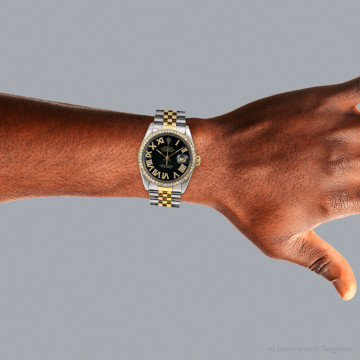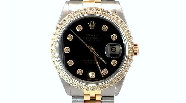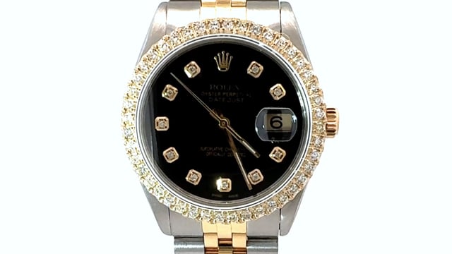 This Men's Two-Tone Rolex Datejust is a luxurious and stylish watch. The watch is made of Gold/Stainless Steel, offering a premium feel. The case measures 36 mm. The bracelet is made of Stainless Steel It features a Jubilee style bracelet for a comfortable fit. And is set with White Diamonds. The dial is Black, enhancing its visual appeal. Powered by an Automatic movement. Offered in Good condition, and comes with a seller's warranty of 60 months. Also available on custom order with additional options. These pre-owned Rolex watches are authentic Rolex watches with genuine diamonds, in excellent condition, they are checked for authenticity and basic water resistance. Watches will withstand an occasional rain just fine, but they are not diver's watches and should not be worn in shower or while swimming.