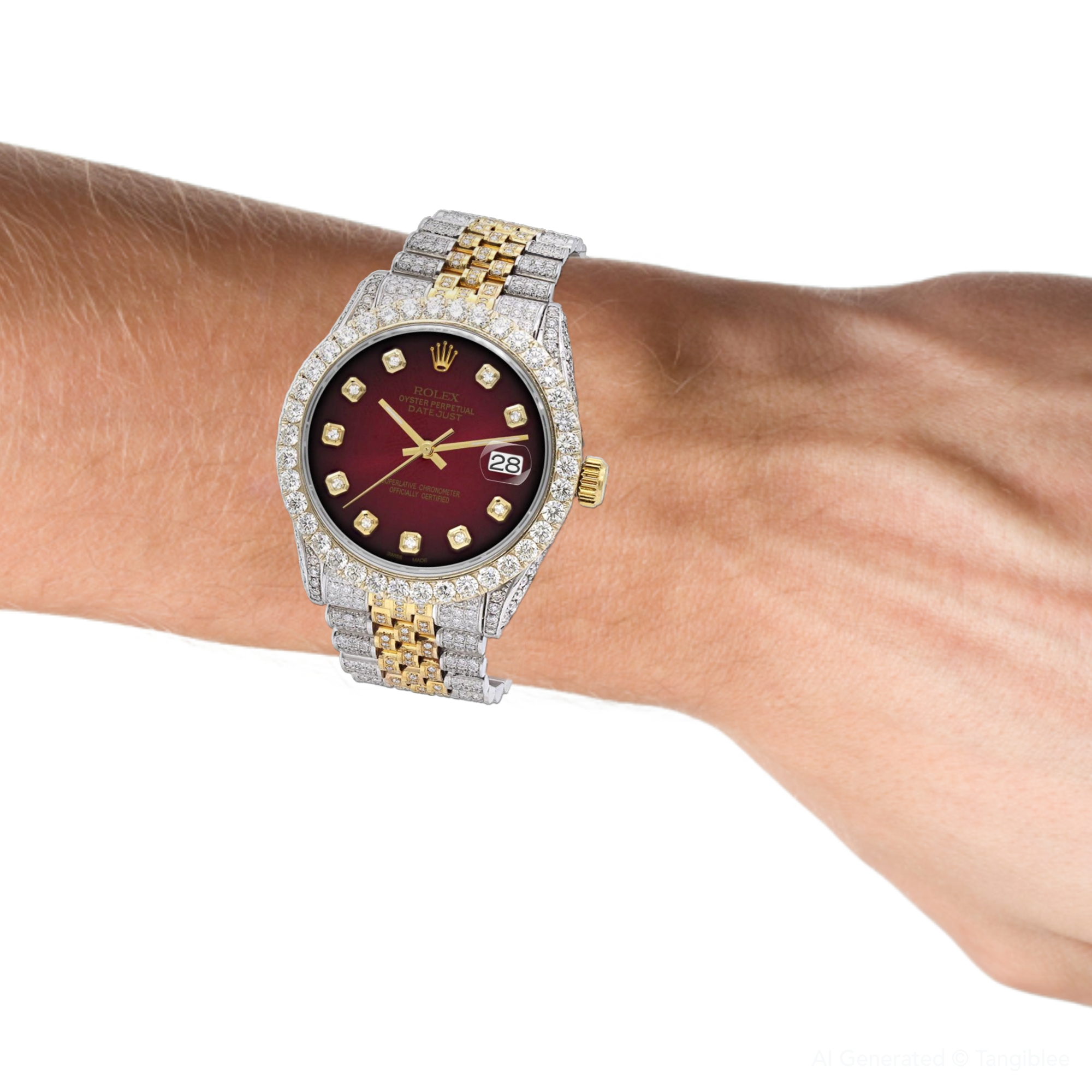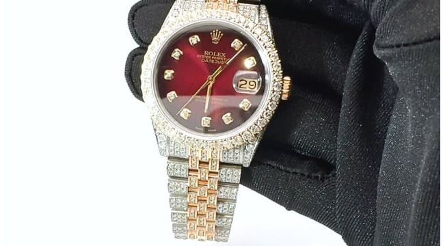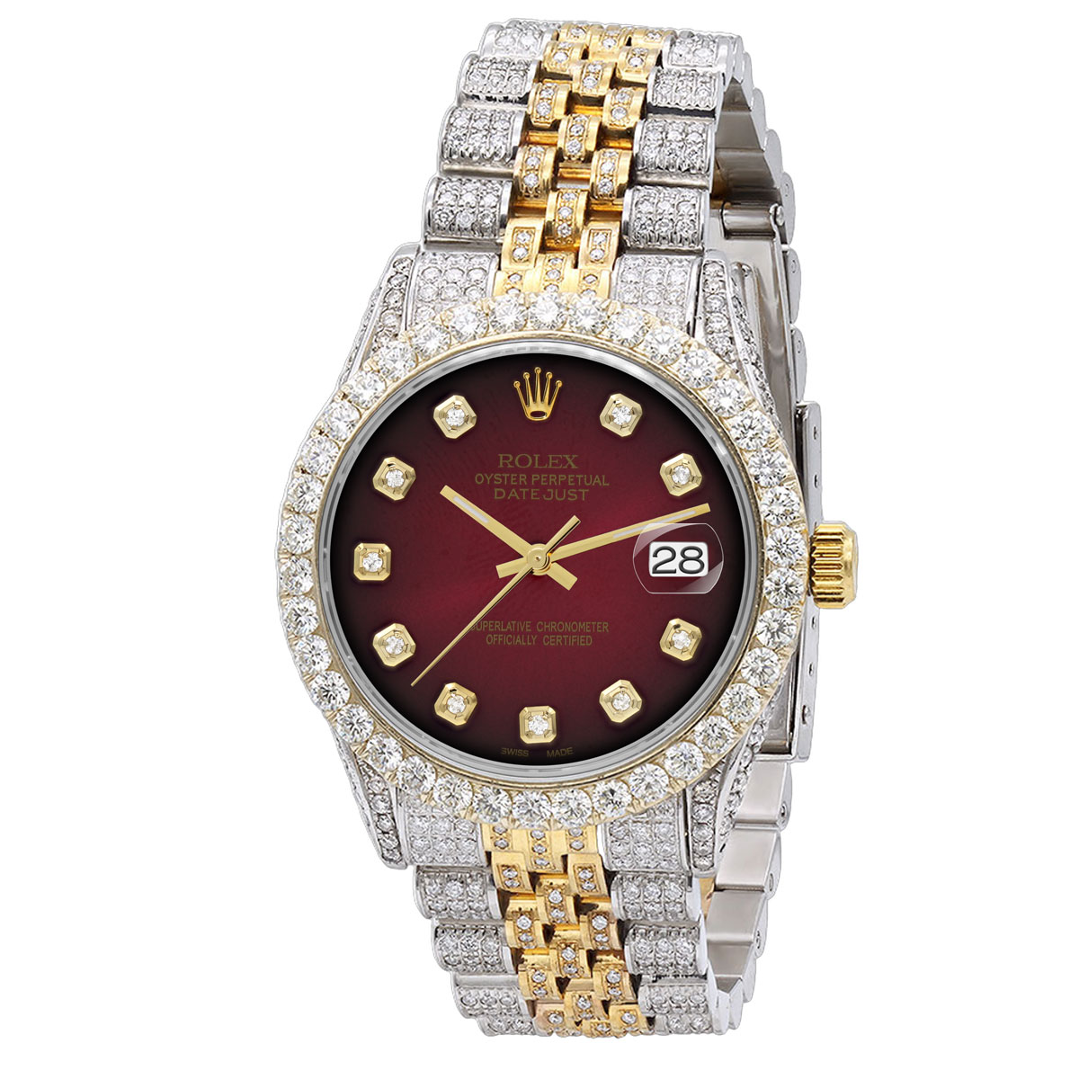 This Men's Bust Down Rolex Datejust is a luxurious and stylish watch. It features a White/Yellow color scheme, adding sophistication to its design. The watch is made of Gold/Stainless Steel, offering a premium feel. The case measures 36 mm. The case is adorned with White Diamonds, enhancing its elegance. The bracelet is made of Stainless Steel It features a Jubilee style bracelet for a comfortable fit. The bezel is made of Yellow Gold and is set with White Diamonds. The dial is Dark Red, enhancing its visual appeal. Powered by an Automatic movement, the watch includes functions such as Date Indicator. Offered in Very Good condition, and comes with a seller's warranty of 60 months. Also available on custom order with additional options. These pre-owned Rolex watches are authentic Rolex watches with genuine diamonds, in excellent condition, they are checked for authenticity and basic water resistance. Watches will withstand an occasional rain just fine, but they are not diver's watches and should not be worn in shower or while swimming.