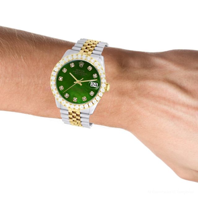 This Men's Two-Tone Rolex Datejust is a luxurious and stylish watch. It features a White/Yellow color scheme, adding sophistication to its design. The watch is made of Gold/Stainless Steel, offering a premium feel. The case measures 36 mm. The bracelet is made of Stainless Steel It features a Jubilee style bracelet for a comfortable fit. The bezel is made of Yellow Gold and is set with White Diamonds. The dial is Emerald Green, enhancing its visual appeal. Powered by an Automatic movement, the watch includes functions such as Date Indicator. Offered in Very Good condition, and comes with a seller's warranty of 60 months. Also available on custom order with additional options. These pre-owned Rolex watches are authentic Rolex watches with genuine diamonds, in excellent condition, they are checked for authenticity and basic water resistance. Watches will withstand an occasional rain just fine, but they are not diver's watches and should not be worn in shower or while swimming.