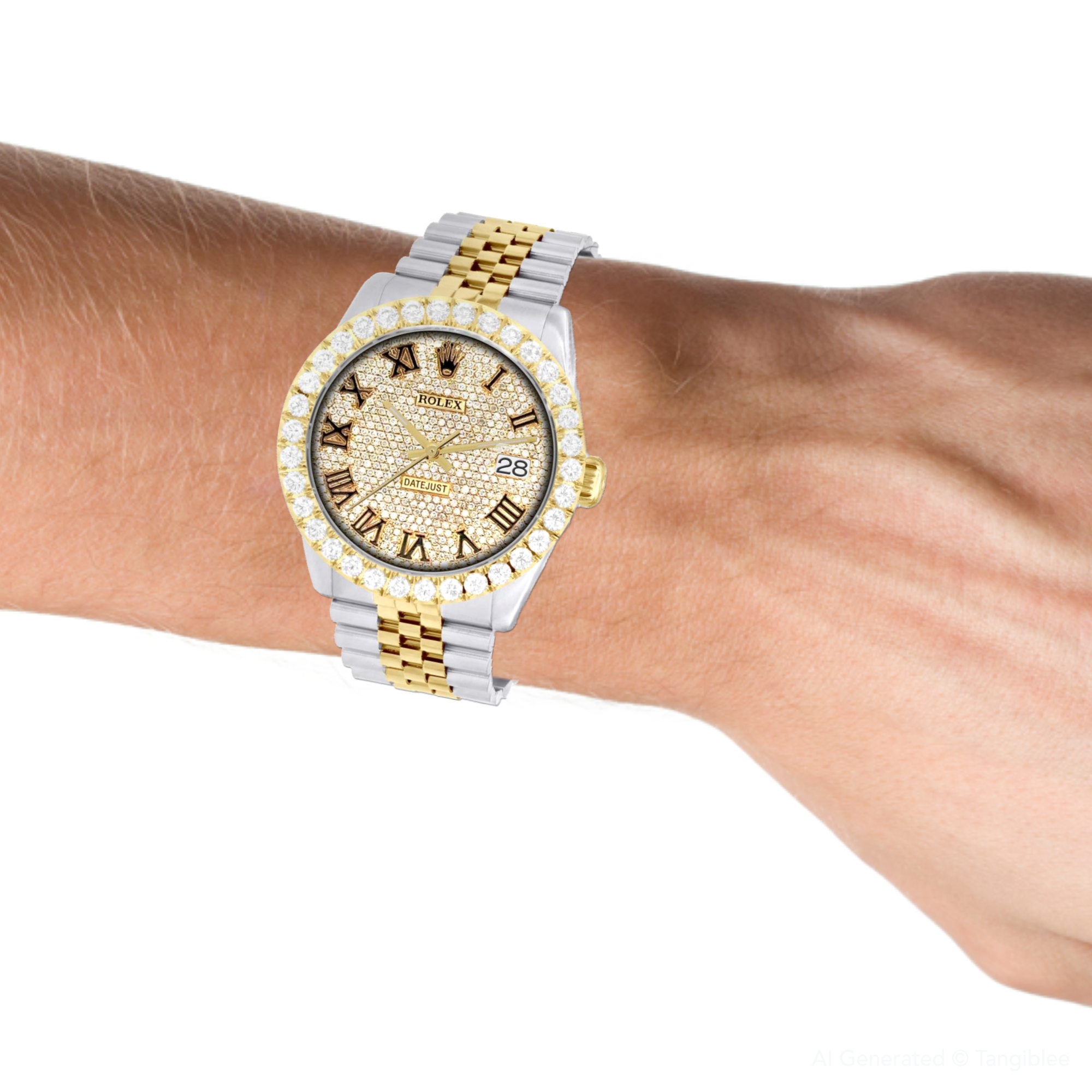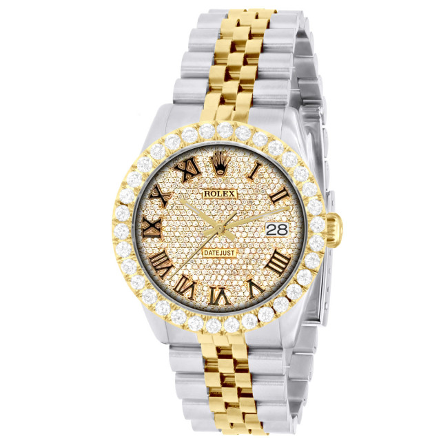 This Men's Bust Down Rolex Datejust is a luxurious and stylish watch. It features a White/Yellow color scheme, adding sophistication to its design. The watch is made of Gold/Stainless Steel, offering a premium feel. The case measures 36 mm. The bracelet is made of Stainless Steel It features a Jubilee style bracelet for a comfortable fit. The bezel is made of Yellow Gold and is set with White Diamonds. The dial is Gold Tone, enhancing its visual appeal. Powered by an Automatic movement, the watch includes functions such as Date Indicator. Offered in Very Good condition, and comes with a seller's warranty of 60 months. Also available on custom order with additional options. These pre-owned Rolex watches are authentic Rolex watches with genuine diamonds, in excellent condition, they are checked for authenticity and basic water resistance. Watches will withstand an occasional rain just fine, but they are not diver's watches and should not be worn in shower or while swimming.