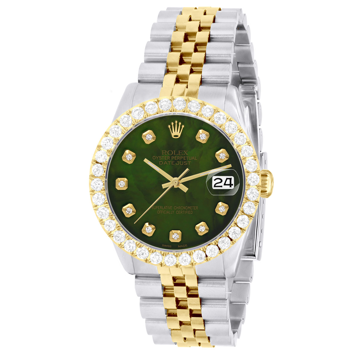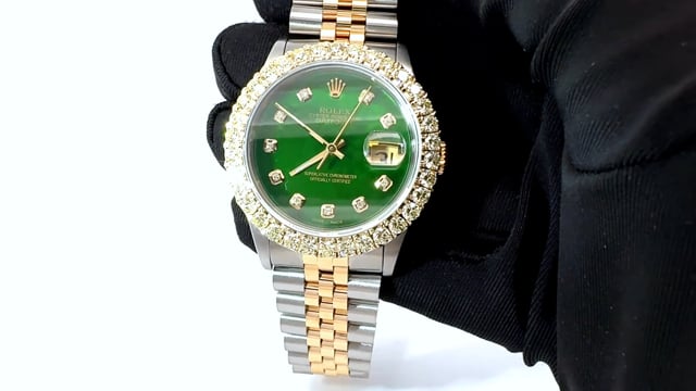 This Men's Two-Tone Rolex Datejust is a luxurious and stylish watch. It features a White/Yellow color scheme, adding sophistication to its design. The watch is made of Gold/Stainless Steel, offering a premium feel. The case measures 36 mm. The bracelet is made of Stainless Steel It features a Jubilee style bracelet for a comfortable fit. The bezel is made of Yellow Gold and is set with White Diamonds. The dial is Green, enhancing its visual appeal. Powered by an Automatic movement, the watch includes functions such as Date Indicator. Offered in Very Good condition, and comes with a seller's warranty of 60 months. Also available on custom order with additional options. These pre-owned Rolex watches are authentic Rolex watches with genuine diamonds, in excellent condition, they are checked for authenticity and basic water resistance. Watches will withstand an occasional rain just fine, but they are not diver's watches and should not be worn in shower or while swimming.
