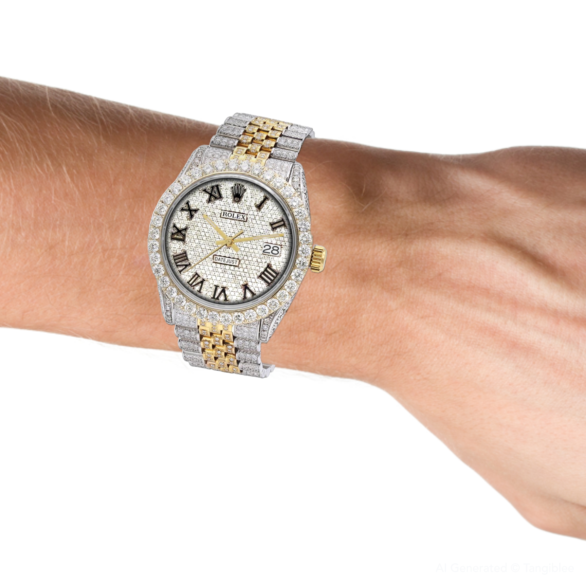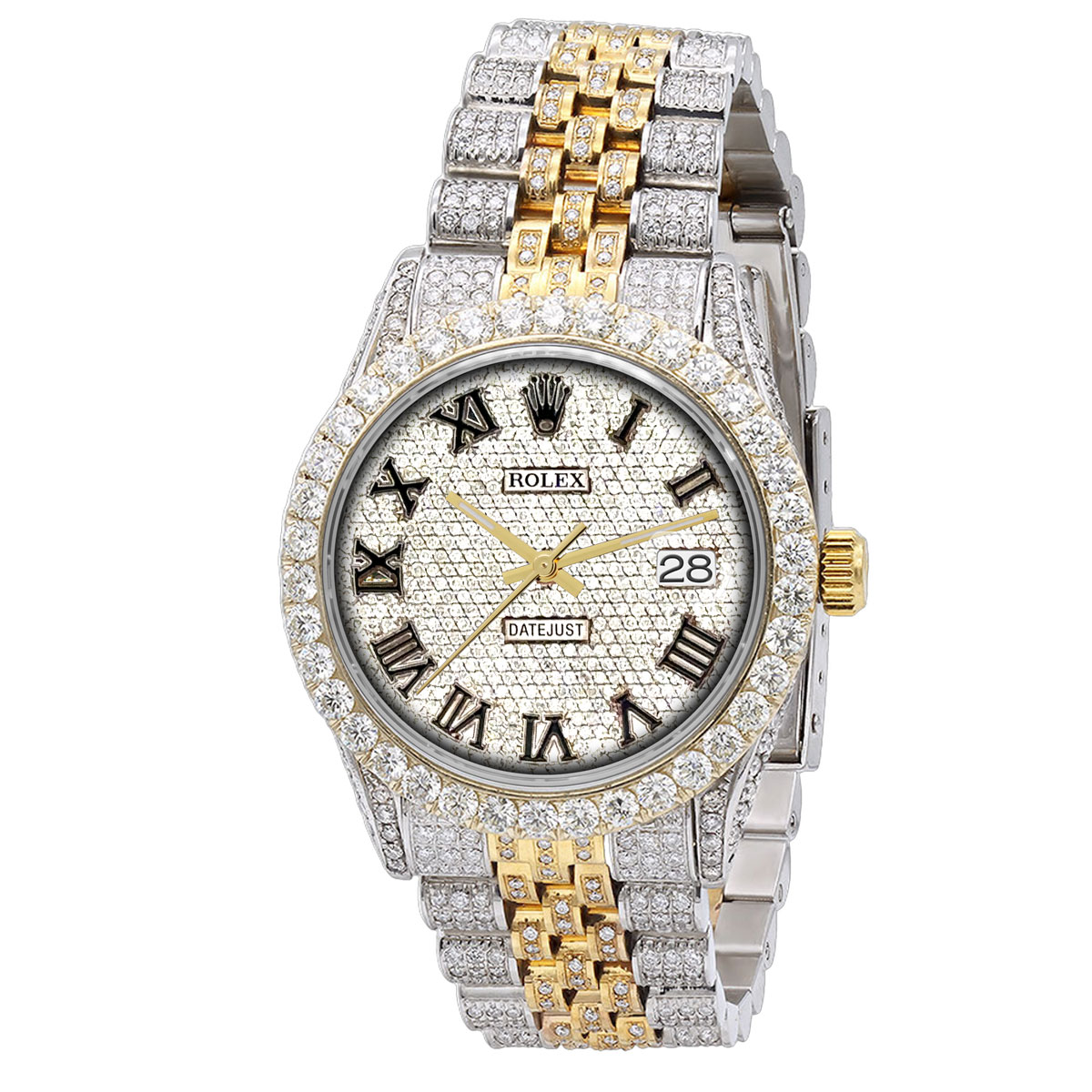 This Men's Bust Down Rolex Datejust is a luxurious and stylish watch. It features a White/Yellow color scheme, adding sophistication to its design. The watch is made of Gold/Stainless Steel, offering a premium feel. The case measures 36 mm. The case is adorned with White Diamonds, enhancing its elegance. The bracelet is made of Stainless Steel It features a Jubilee style bracelet for a comfortable fit. The bezel is made of Yellow Gold and is set with White Diamonds. The dial is Silver Tone, enhancing its visual appeal. Powered by an Automatic movement, the watch includes functions such as Date Indicator. Offered in Very Good condition, and comes with a seller's warranty of 60 months. Also available on custom order with additional options. These pre-owned Rolex watches are authentic Rolex watches with genuine diamonds, in excellent condition, they are checked for authenticity and basic water resistance. Watches will withstand an occasional rain just fine, but they are not diver's watches and should not be worn in shower or while swimming.