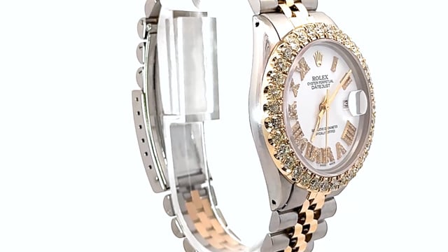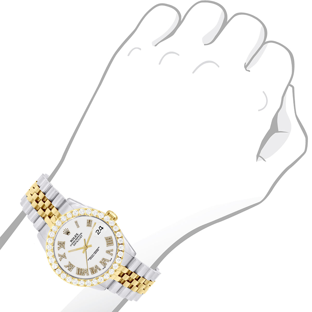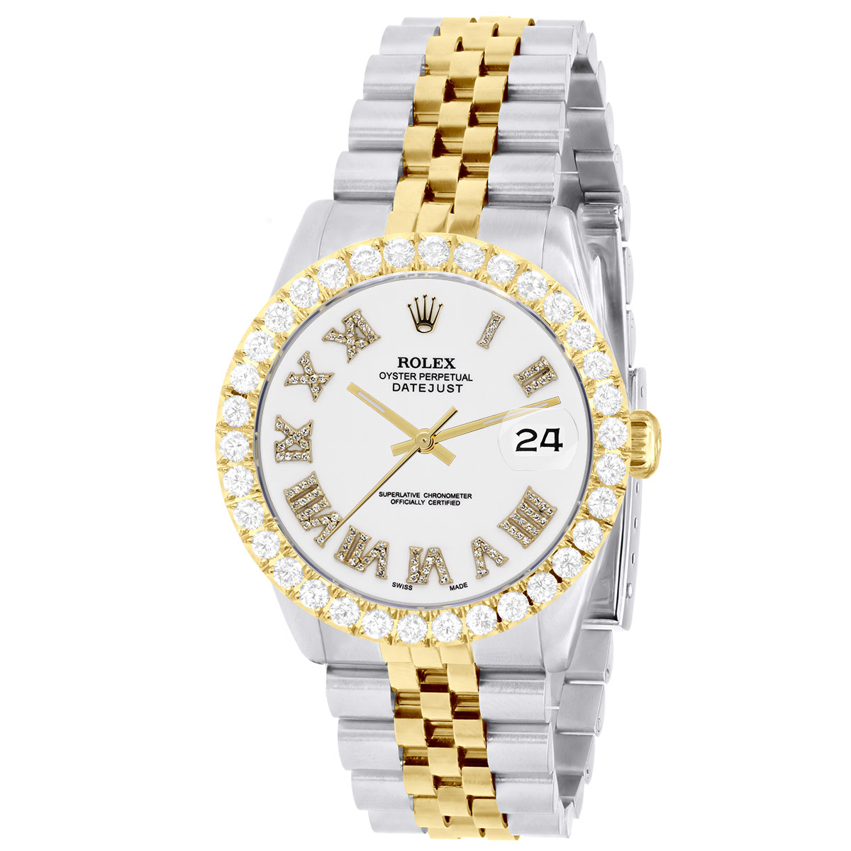 This Men's Two-Tone Rolex Datejust is a luxurious and stylish watch. It features a White/Yellow color scheme, adding sophistication to its design. The watch is made of Gold/Stainless Steel, offering a premium feel. The case measures 36 mm. The bracelet is made of Stainless Steel It features a Jubilee style bracelet for a comfortable fit. The bezel is made of Yellow Gold and is set with White Diamonds. The dial is White, enhancing its visual appeal. Powered by an Automatic movement, the watch includes functions such as Date Indicator. Offered in Very Good condition, and comes with a seller's warranty of 60 months. Also available on custom order with additional options. These pre-owned Rolex watches are authentic Rolex watches with genuine diamonds, in excellent condition, they are checked for authenticity and basic water resistance. Watches will withstand an occasional rain just fine, but they are not diver's watches and should not be worn in shower or while swimming.