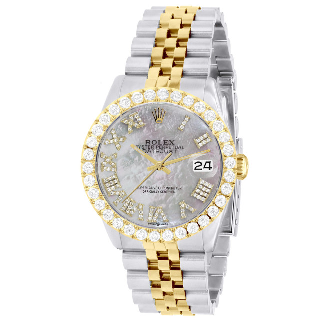 This Men's Two-Tone Rolex Datejust is a luxurious and stylish watch. It features a White/Yellow color scheme, adding sophistication to its design. The watch is made of Gold/Stainless Steel, offering a premium feel. The case measures 36 mm. The bracelet is made of Stainless Steel It features a Jubilee style bracelet for a comfortable fit. The bezel is made of Yellow Gold and is set with White Diamonds. The dial is White, enhancing its visual appeal. Powered by an Automatic movement, the watch includes functions such as Date Indicator. Offered in Very Good condition, and comes with a seller's warranty of 60 months. Also available on custom order with additional options. These pre-owned Rolex watches are authentic Rolex watches with genuine diamonds, in excellent condition, they are checked for authenticity and basic water resistance. Watches will withstand an occasional rain just fine, but they are not diver's watches and should not be worn in shower or while swimming.