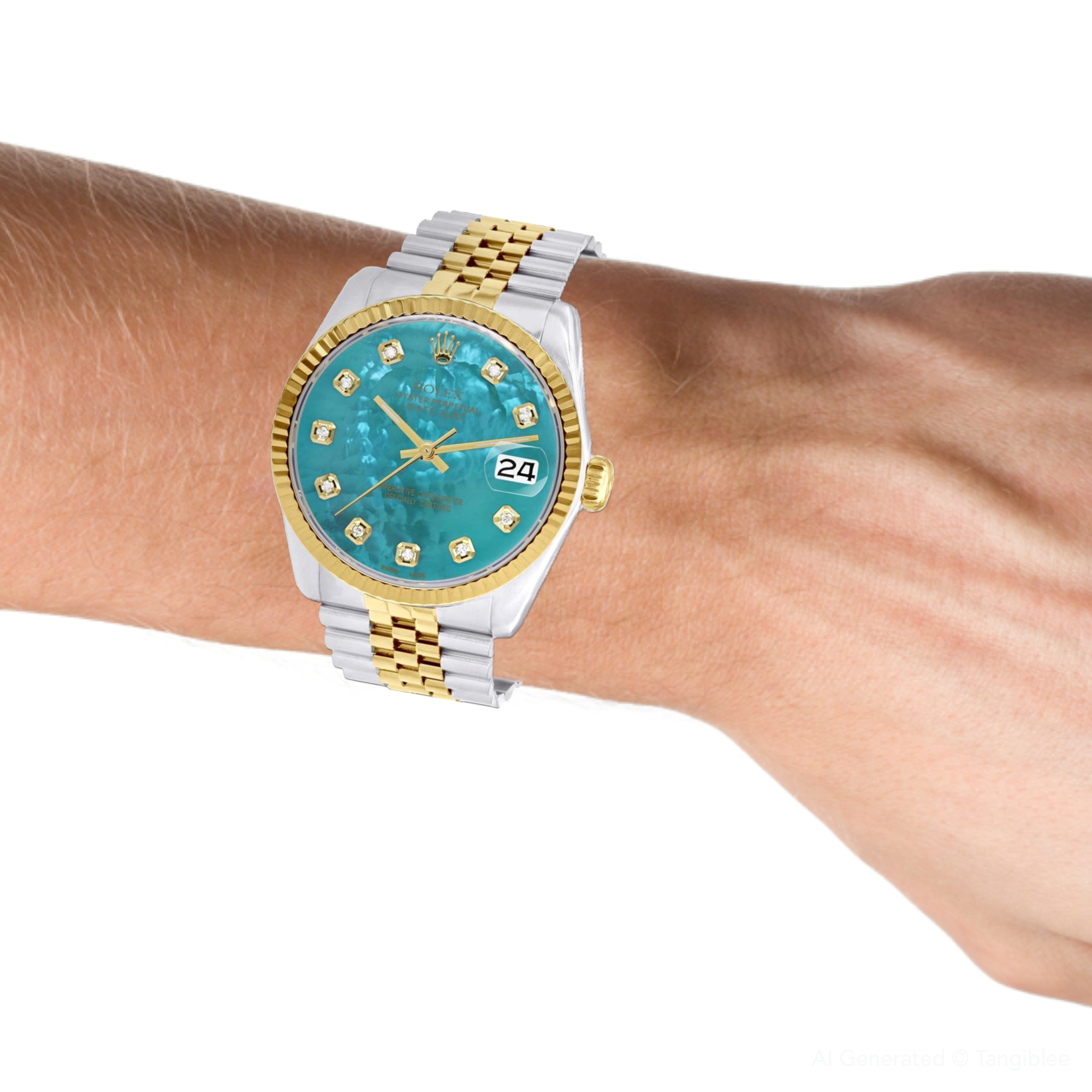 This Men's Two-Tone Rolex Datejust is a luxurious and stylish watch. It features a White/Yellow color scheme, adding sophistication to its design. The watch is made of Gold/Stainless Steel, offering a premium feel. The case measures 36 mm. The bracelet is made of Stainless Steel It features a Jubilee style bracelet for a comfortable fit. The bezel is made of Yellow Gold. The dial is Turquoise, enhancing its visual appeal. Powered by an Automatic movement, the watch includes functions such as Date Indicator. Offered in Very Good condition, and comes with a seller's warranty of 60 months. Also available on custom order with additional options. These pre-owned Rolex watches are authentic Rolex watches with genuine diamonds, in excellent condition, they are checked for authenticity and basic water resistance. Watches will withstand an occasional rain just fine, but they are not diver's watches and should not be worn in shower or while swimming.