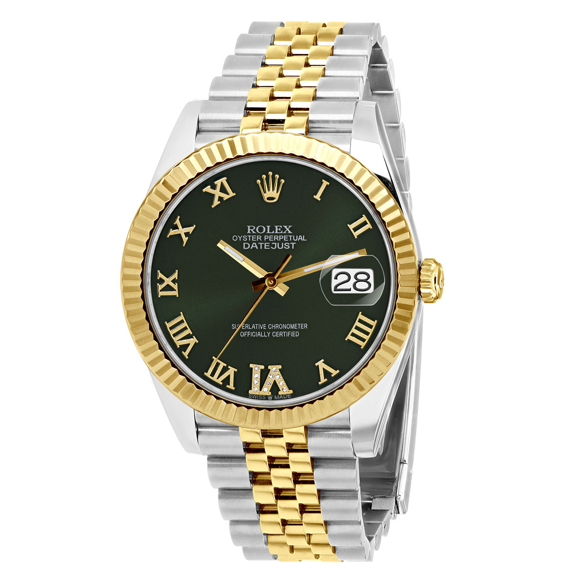 This Men's Two-Tone Rolex Datejust is a luxurious and stylish watch. It features a White/Yellow color scheme, adding sophistication to its design. The watch is made of Gold/Stainless Steel, offering a premium feel. The case measures 41 mm. The bracelet is made of Stainless Steel It features a Jubilee style bracelet for a comfortable fit. The bezel is made of Yellow Gold. The dial is Dark Green, enhancing its visual appeal. Powered by an Automatic movement, the watch includes functions such as Date Indicator. Offered in Very Good condition, and comes with a seller's warranty of 60 months. Also available on custom order with additional options. These pre-owned Rolex watches are authentic Rolex watches with genuine diamonds, in excellent condition, they are checked for authenticity and basic water resistance. Watches will withstand an occasional rain just fine, but they are not diver's watches and should not be worn in shower or while swimming.