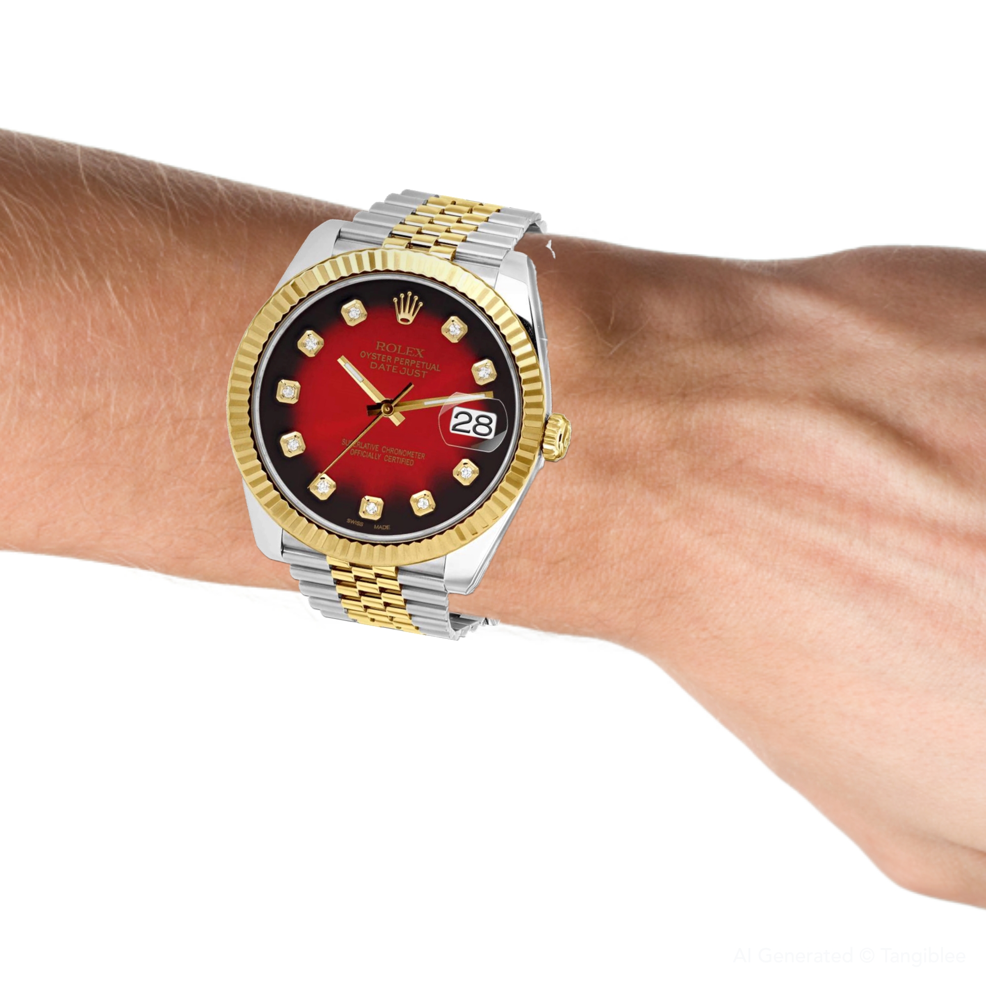 This Men's Two-Tone Rolex Datejust is a luxurious and stylish watch. It features a White/Yellow color scheme, adding sophistication to its design. The watch is made of Gold/Stainless Steel, offering a premium feel. The case measures 41 mm. The bracelet is made of Stainless Steel It features a Jubilee style bracelet for a comfortable fit. The bezel is made of Yellow Gold. The dial is Dark Red, enhancing its visual appeal. Powered by an Automatic movement, the watch includes functions such as Date Indicator. Offered in Very Good condition, and comes with a seller's warranty of 60 months. Also available on custom order with additional options. These pre-owned Rolex watches are authentic Rolex watches with genuine diamonds, in excellent condition, they are checked for authenticity and basic water resistance. Watches will withstand an occasional rain just fine, but they are not diver's watches and should not be worn in shower or while swimming.
