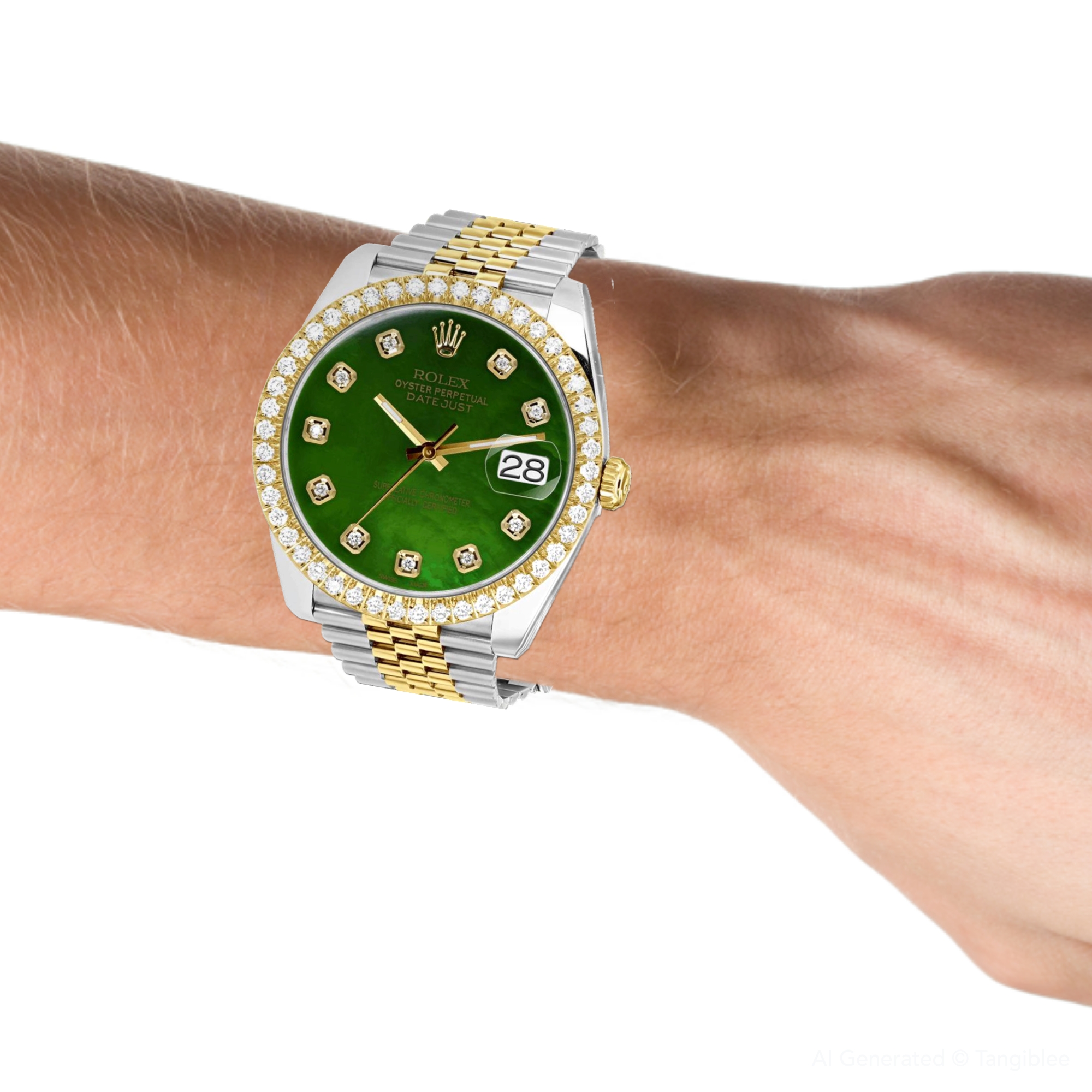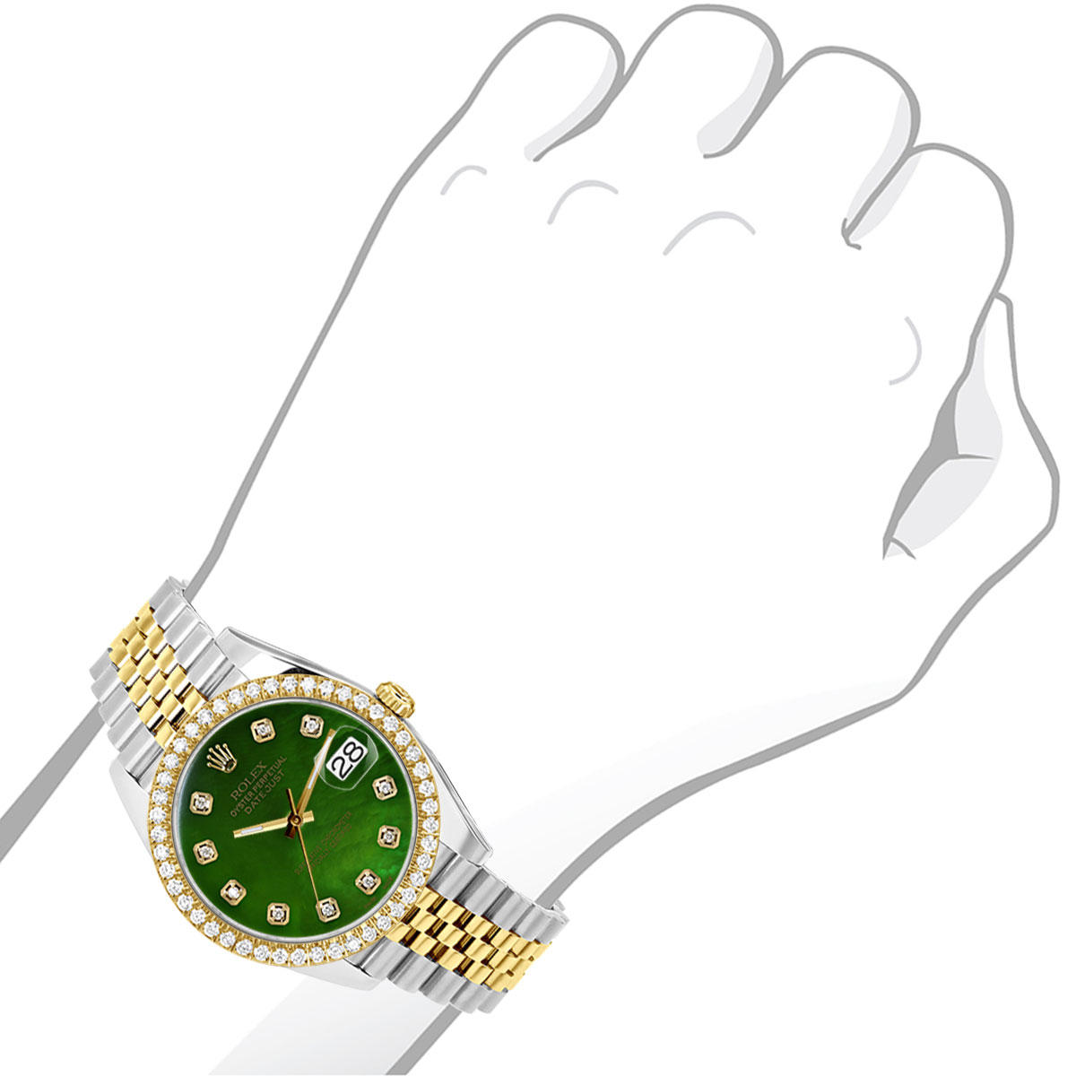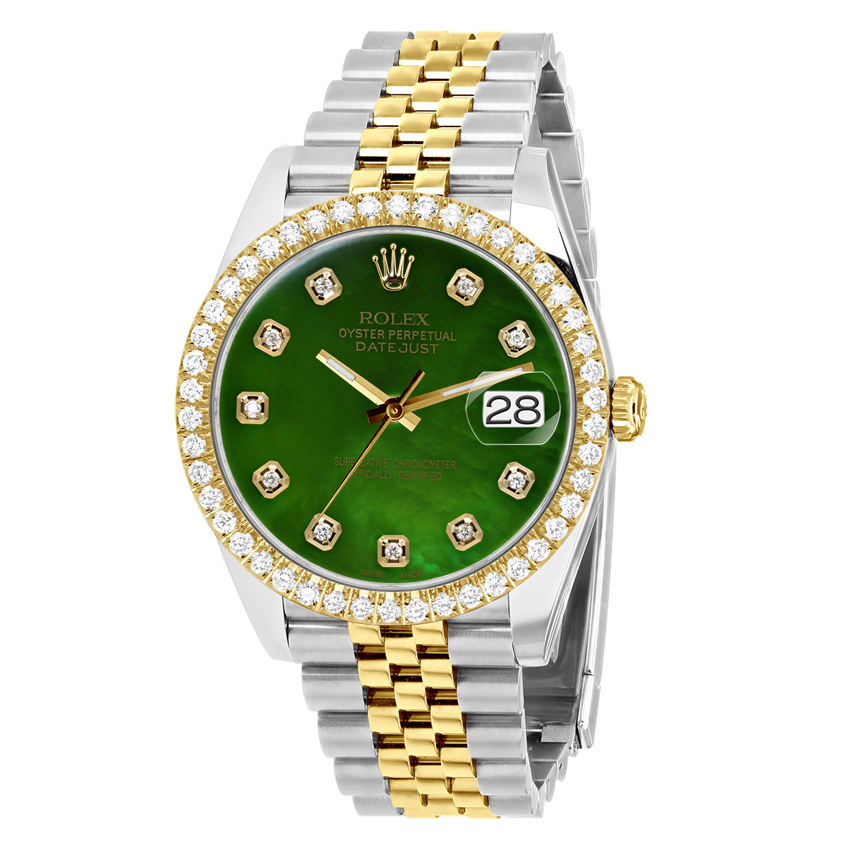 This Men's Two-Tone Rolex Datejust is a luxurious and stylish watch. It features a White/Yellow color scheme, adding sophistication to its design. The watch is made of Gold/Stainless Steel, offering a premium feel. The case measures 41 mm. The bracelet is made of Stainless Steel It features a Jubilee style bracelet for a comfortable fit. The bezel is made of Yellow Gold and is set with White Diamonds. The dial is Green, enhancing its visual appeal. Powered by an Automatic movement, the watch includes functions such as Date Indicator. Offered in Very Good condition, and comes with a seller's warranty of 60 months. Also available on custom order with additional options. These pre-owned Rolex watches are authentic Rolex watches with genuine diamonds, in excellent condition, they are checked for authenticity and basic water resistance. Watches will withstand an occasional rain just fine, but they are not diver's watches and should not be worn in shower or while swimming.