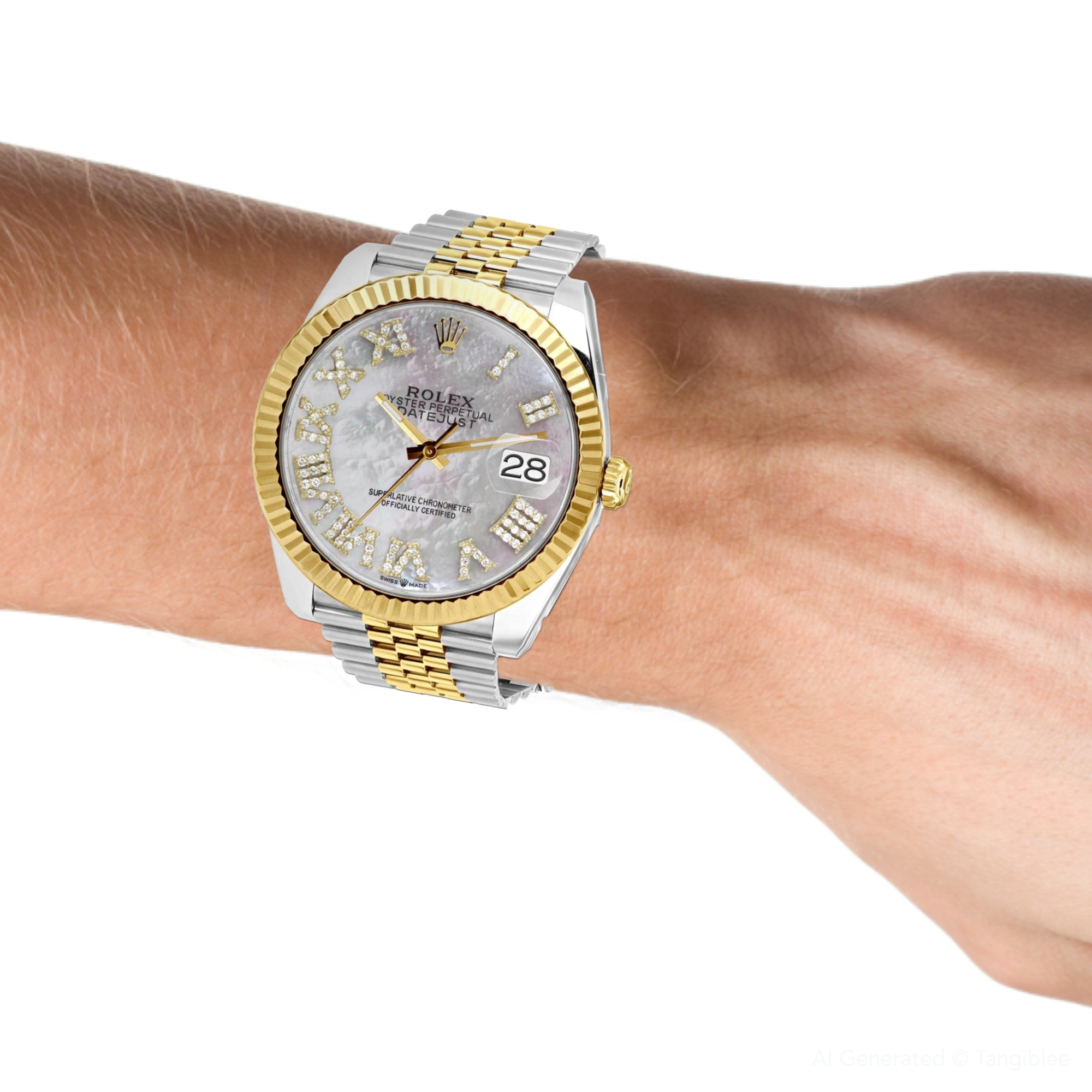 This Men's Two-Tone Rolex Datejust is a luxurious and stylish watch. It features a White/Yellow color scheme, adding sophistication to its design. The watch is made of Gold/Stainless Steel, offering a premium feel. The case measures 41 mm. The bracelet is made of Stainless Steel It features a Jubilee style bracelet for a comfortable fit. The bezel is made of Yellow Gold. The dial is White, enhancing its visual appeal. Powered by an Automatic movement, the watch includes functions such as Date Indicator. Offered in Very Good condition, and comes with a seller's warranty of 60 months. Also available on custom order with additional options. These pre-owned Rolex watches are authentic Rolex watches with genuine diamonds, in excellent condition, they are checked for authenticity and basic water resistance. Watches will withstand an occasional rain just fine, but they are not diver's watches and should not be worn in shower or while swimming.
