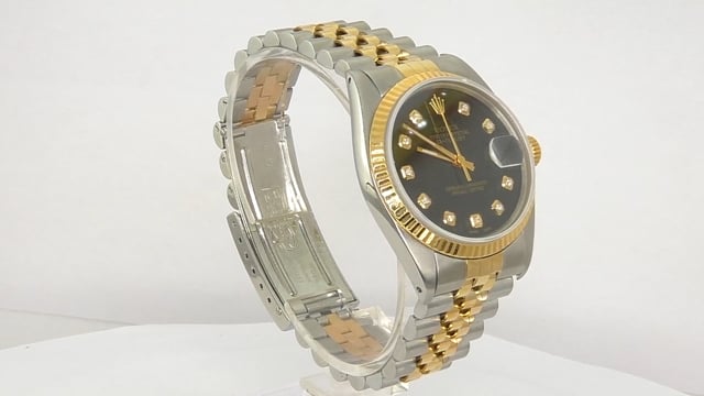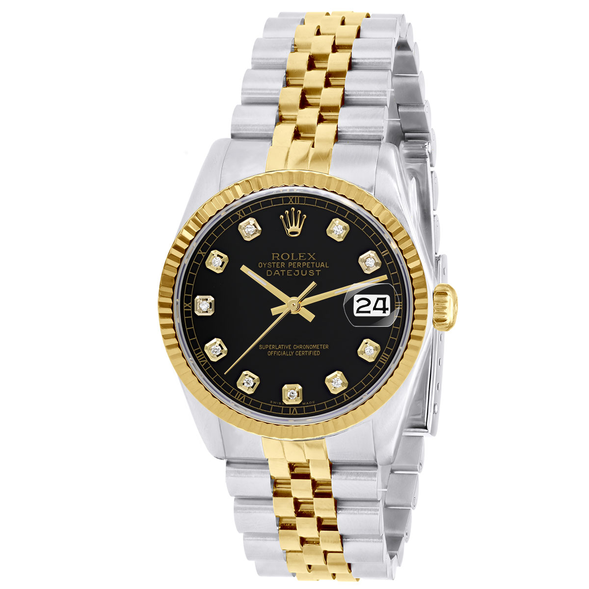 This Men's Two-Tone Rolex Oyster Perpetual Datejust is a luxurious and stylish watch. The watch is made of Gold/Stainless Steel, offering a premium feel. The case measures 36 mm. The bracelet is made of Stainless Steel It features a Jubilee style bracelet for a comfortable fit. The bezel is made of Gold. The dial is Black, enhancing its visual appeal. Powered by an Automatic movement. Offered in Good condition, and comes with a seller's warranty of 60 months. Also available on custom order with additional options. These pre-owned Rolex watches are authentic Rolex watches with genuine diamonds, in excellent condition, they are checked for authenticity and basic water resistance. Watches will withstand an occasional rain just fine, but they are not diver's watches and should not be worn in shower or while swimming.