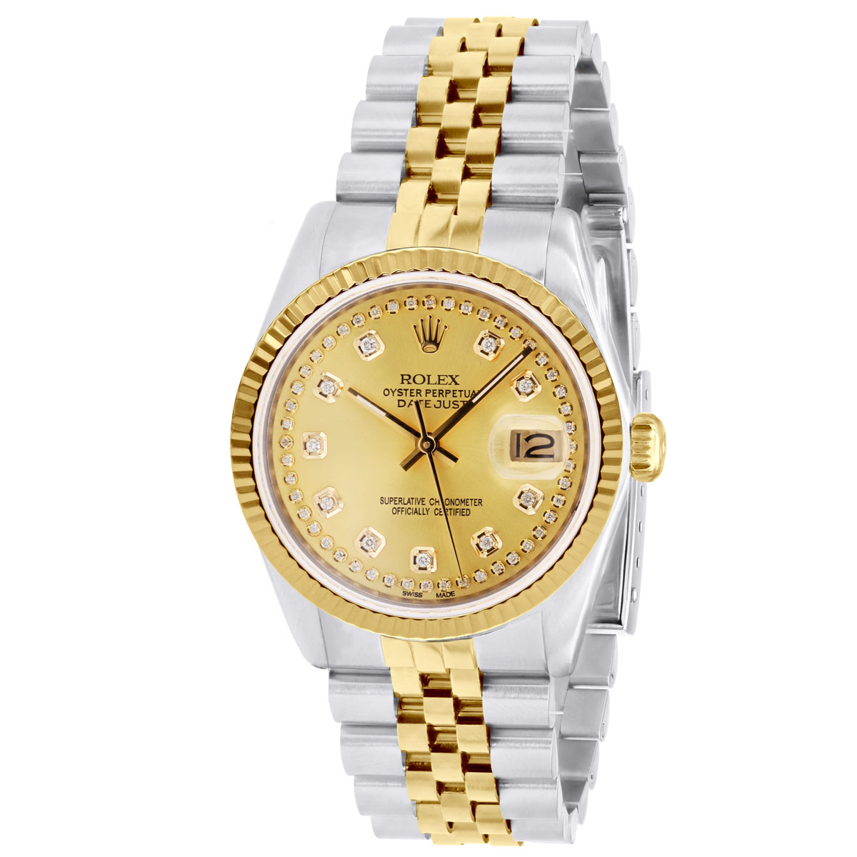 This Men's Two-Tone Rolex Oyster Perpetual Datejust is a luxurious and stylish watch. It features a Yellow color scheme, adding sophistication to its design. The watch is made of Gold/Stainless Steel, offering a premium feel. The case measures 36 mm. The bracelet is made of Stainless Steel It features a Jubilee style bracelet for a comfortable fit. The bezel is made of Yellow Gold. The dial is Gold Tone, enhancing its visual appeal. Powered by an Automatic movement, the watch includes functions such as Date Indicator. Offered in Good condition, and comes with a seller's warranty of 60 months. Also available on custom order with additional options. These pre-owned Rolex watches are authentic Rolex watches with genuine diamonds, in excellent condition, they are checked for authenticity and basic water resistance. Watches will withstand an occasional rain just fine, but they are not diver's watches and should not be worn in shower or while swimming.