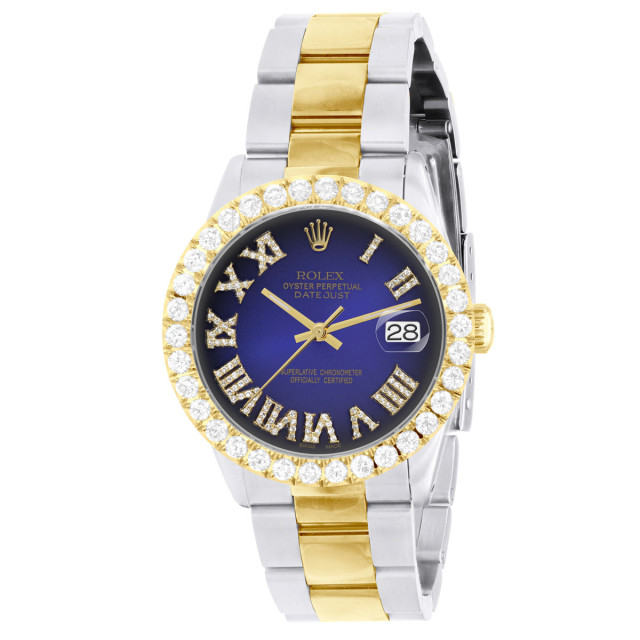 This Men's Two-Tone Rolex Oyster Perpetual Datejust is a luxurious and stylish watch. The watch is made of Gold/Stainless Steel, offering a premium feel. The case measures 36 mm. The bracelet is made of Yellow Gold It features an Oyster style bracelet for a comfortable fit. The bezel is made of Yellow Gold and is set with White Diamonds. The dial is Dark Blue, enhancing its visual appeal. Powered by an Automatic movement, the watch includes functions such as Date Indicator. Offered in Good condition, and comes with a seller's warranty of 60 months. Also available on custom order with additional options. These pre-owned Rolex watches are authentic Rolex watches with genuine diamonds, in excellent condition, they are checked for authenticity and basic water resistance. Watches will withstand an occasional rain just fine, but they are not diver's watches and should not be worn in shower or while swimming.