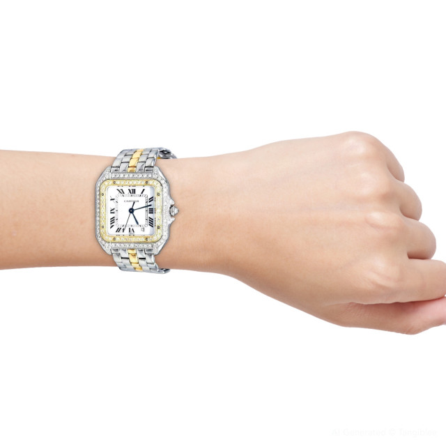 This Women's Two-Tone Cartier Panthere is a luxurious and stylish watch. The watch is made of Gold/Stainless Steel, offering a premium feel. The case measures 27 mm. The bracelet is made of Yellow Gold. The bezel is made of Gold and is set with White. The dial is White, enhancing its visual appeal. Powered by a Quartz movement, the watch includes functions such as Date Indicator. Offered in Good condition, and comes with a seller's warranty of 60 months. Also available on custom order with additional options. Please note this Cartier watch is pre-owned, in excellent condition, the diamonds are high quality, natural diamonds, set by our master craftsmen, watch box might show signs of wear (watch itself will be in perfect condition), comes with a 5 year warranty from ItsHot.