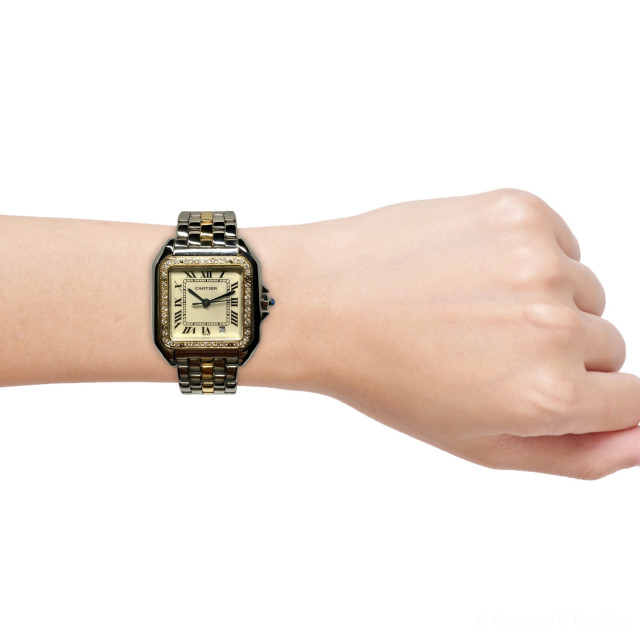 This Women's Two-Tone Cartier Panthere is a luxurious and stylish watch. The watch is made of Gold/Stainless Steel, offering a premium feel. The case measures 27 mm. The bracelet is made of Yellow Gold. The bezel is made of Gold and is set with White. The dial is White, enhancing its visual appeal. Powered by a Quartz movement, the watch includes functions such as Date Indicator. Offered in Good condition, and comes with a seller's warranty of 60 months. Also available on custom order with additional options. Please note this Cartier watch is pre-owned, in excellent condition, the diamonds are high quality, natural diamonds, set by our master craftsmen, watch box might show signs of wear (watch itself will be in perfect condition), comes with a 5 year warranty from ItsHot.