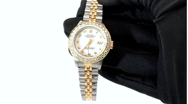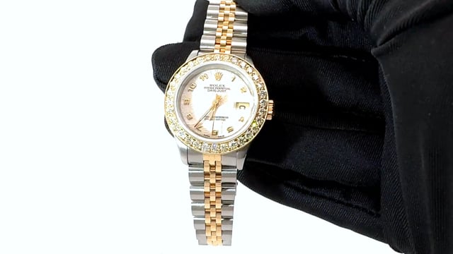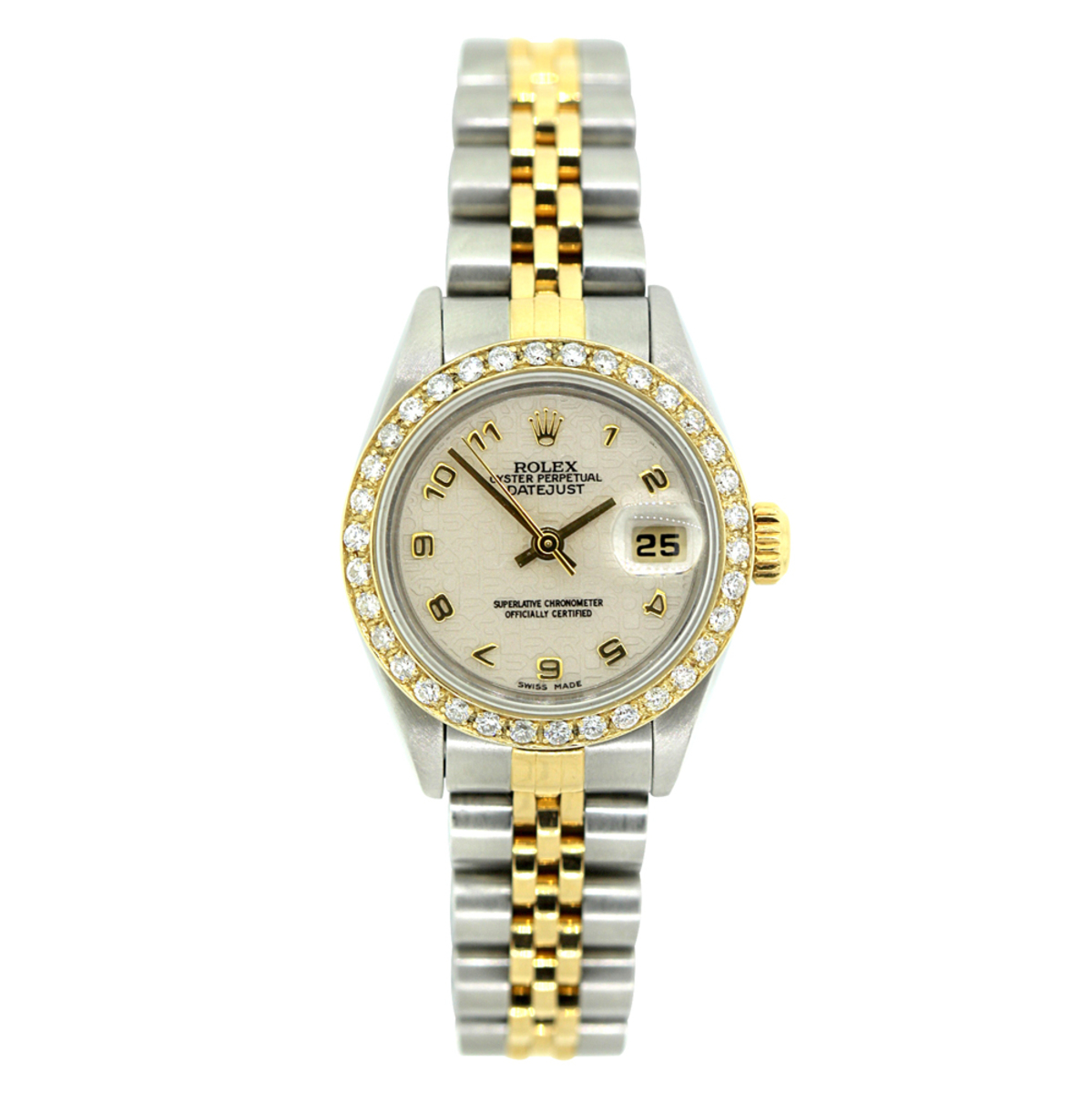 This Women's Casual Rolex Oyster Perpetual Datejust is a luxurious and stylish watch. The watch is made of Gold/Stainless Steel, offering a premium feel. The case measures 26 mm. The bracelet is made of Stainless Steel It features a Jubilee style bracelet for a comfortable fit. The bezel is made of Yellow Gold and is set with White Diamonds. The dial is Yellow, enhancing its visual appeal. Powered by an Automatic movement, the watch includes functions such as Date Indicator. Offered in Very Good condition, and comes with a seller's warranty of 60 months. Also available on custom order with additional options. These pre-owned Rolex watches are authentic Rolex watches with genuine diamonds, in excellent condition, they are checked for authenticity and basic water resistance. Watches will withstand an occasional rain just fine, but they are not diver's watches and should not be worn in shower or while swimming.