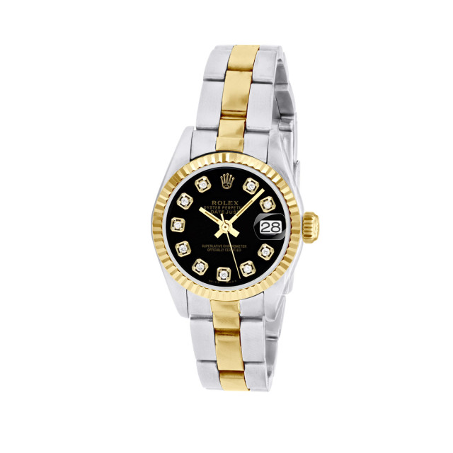 This Women's Two-Tone Rolex Oyster Perpetual Datejust is a luxurious and stylish watch. The watch is made of Gold/Stainless Steel, offering a premium feel. The case measures 26 mm. The bracelet is made of Yellow Gold It features an Oyster style bracelet for a comfortable fit. The bezel is made of Yellow Gold and is set with White Diamonds. The dial is Black, enhancing its visual appeal. Powered by an Automatic movement. Offered in Good condition, and comes with a seller's warranty of 60 months. Also available on custom order with additional options. These pre-owned Rolex watches are authentic Rolex watches with genuine diamonds, in excellent condition, they are checked for authenticity and basic water resistance. Watches will withstand an occasional rain just fine, but they are not diver's watches and should not be worn in shower or while swimming.