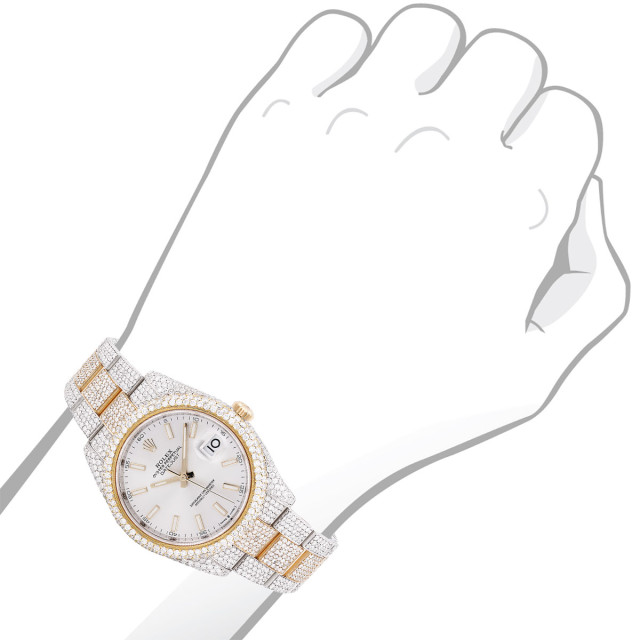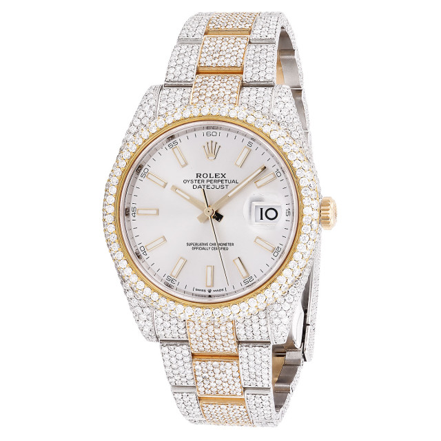 This Men's Bust Down Rolex Oyster Perpetual Datejust is a luxurious and stylish watch. It features a White/Yellow color scheme, adding sophistication to its design. The watch is made of Gold/Stainless Steel, offering a premium feel. The case measures 41 mm. The case is adorned with White Diamonds, enhancing its elegance. The bracelet is made of Yellow Gold and is set with White Diamonds. It features an Oyster style bracelet for a comfortable fit. The bezel is made of Yellow Gold and is set with White Diamonds. The dial is White, enhancing its visual appeal. Powered by an Automatic movement, the watch includes functions such as Date Indicator. Offered in Very Good condition, and comes with a seller's warranty of 60 months. Also available on custom order with additional options. These pre-owned Rolex watches are authentic Rolex watches with genuine diamonds, in excellent condition, they are checked for authenticity and basic water resistance. Watches will withstand an occasional rain just fine, but they are not diver's watches and should not be worn in shower or while swimming.