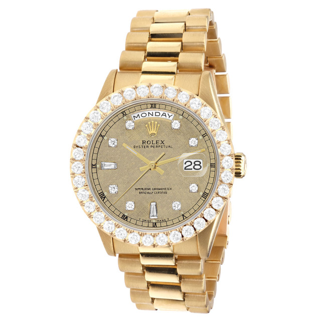 This Men's Rolex Day-Date is a luxurious and stylish watch. It features a Yellow color scheme, adding sophistication to its design. The watch is made of 18k Gold, offering a premium feel. The case measures 36 mm. The case is crafted from 18k Gold. The bracelet is made of Yellow Gold It features a President style bracelet for a comfortable fit. The bezel is made of Yellow Gold and is set with White Diamonds. The dial is Gold Tone, enhancing its visual appeal. Powered by an Automatic movement, the watch includes functions such as Date Indicator. Offered in Very Good condition, and comes with a seller's warranty of 60 months. Also available on custom order with additional options. These pre-owned Rolex watches are authentic Rolex watches with genuine diamonds, in excellent condition, they are checked for authenticity and basic water resistance. Watches will withstand an occasional rain just fine, but they are not diver's watches and should not be worn in shower or while swimming.