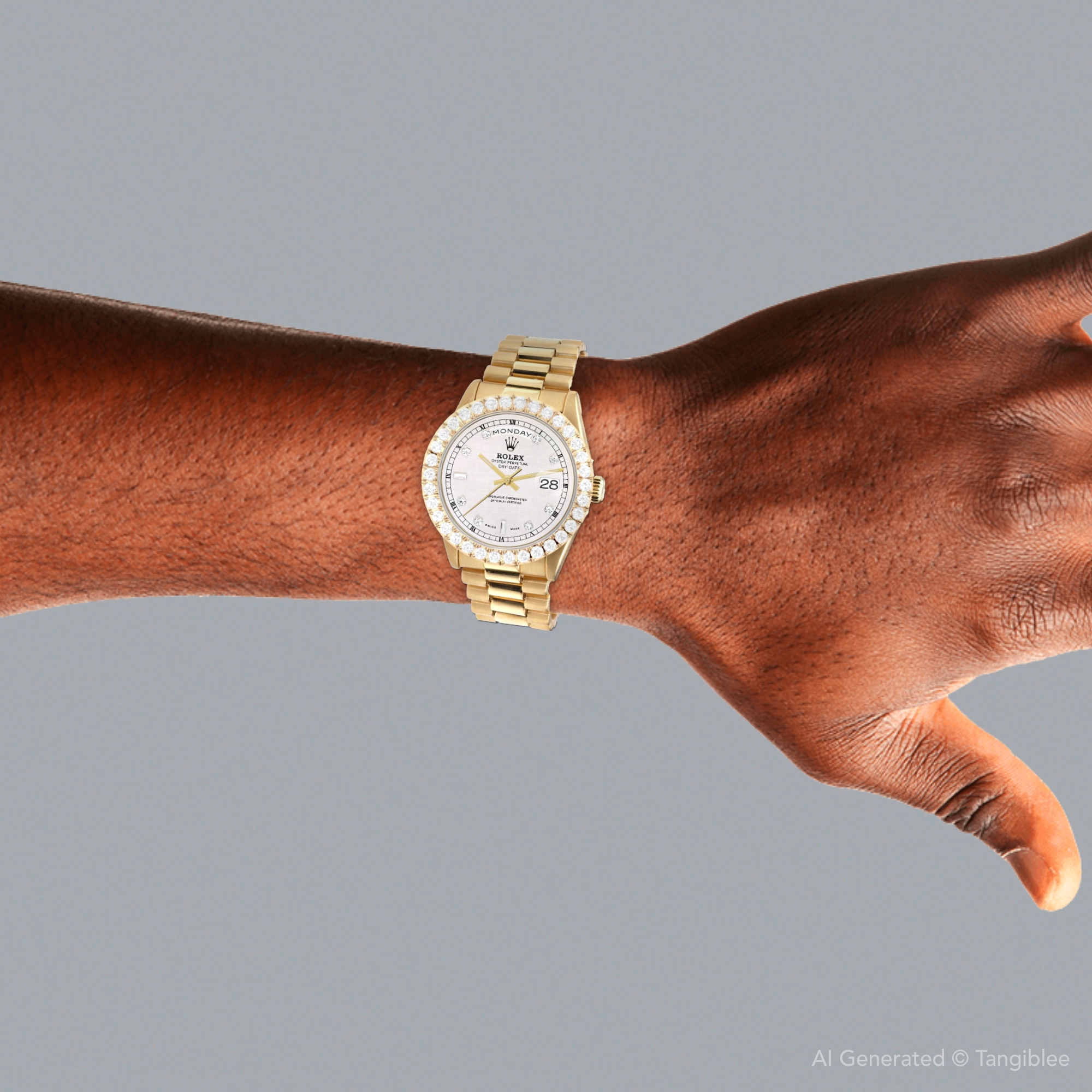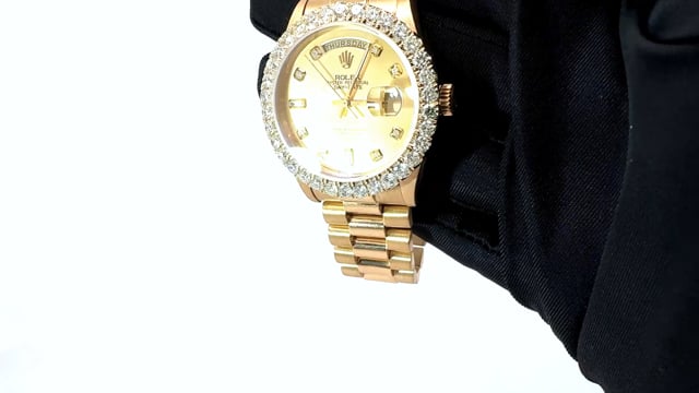 This Men's Rolex Day-Date is a luxurious and stylish watch. It features a Yellow color scheme, adding sophistication to its design. The watch is made of 18k Gold, offering a premium feel. The case measures 36 mm. The case is crafted from 18k Gold. The bracelet is made of Yellow Gold It features a President style bracelet for a comfortable fit. The bezel is made of Yellow Gold and is set with White Diamonds. The dial is Rose, enhancing its visual appeal. Powered by an Automatic movement, the watch includes functions such as Date Indicator. Offered in Very Good condition, and comes with a seller's warranty of 60 months. Also available on custom order with additional options. These pre-owned Rolex watches are authentic Rolex watches with genuine diamonds, in excellent condition, they are checked for authenticity and basic water resistance. Watches will withstand an occasional rain just fine, but they are not diver's watches and should not be worn in shower or while swimming.