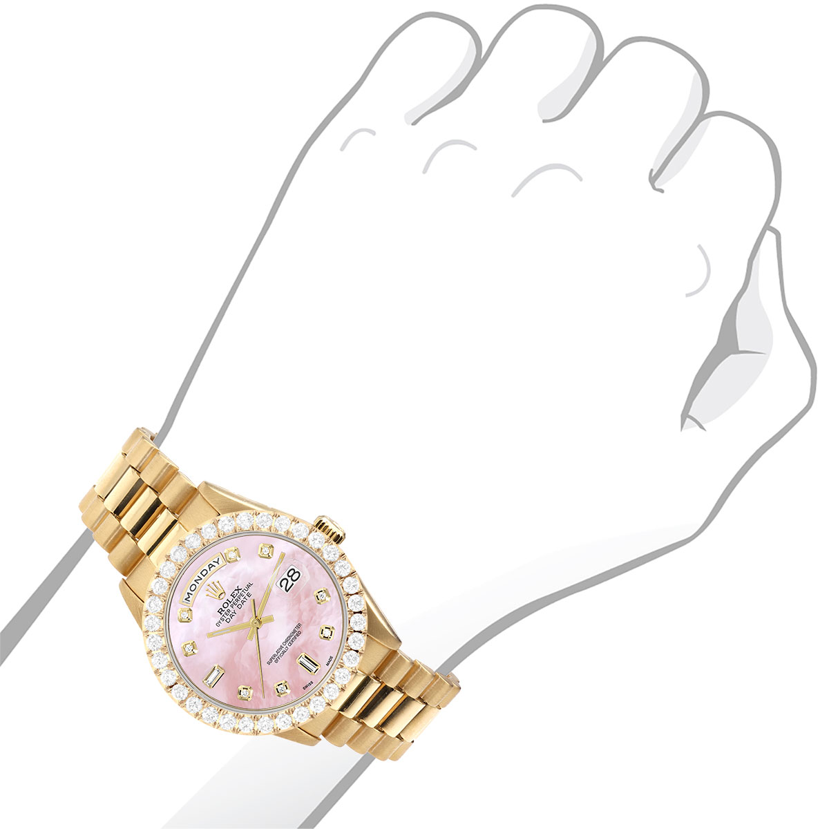 This Men's Rolex Day-Date is a luxurious and stylish watch. It features a Yellow color scheme, adding sophistication to its design. The watch is made of 18k Gold, offering a premium feel. The case measures 36 mm. The case is crafted from 18k Gold. The bracelet is made of Yellow Gold It features a President style bracelet for a comfortable fit. The bezel is made of Yellow Gold and is set with White Diamonds. The dial is Rose, enhancing its visual appeal. Powered by an Automatic movement, the watch includes functions such as Date Indicator. Offered in Very Good condition, and comes with a seller's warranty of 60 months. Also available on custom order with additional options. These pre-owned Rolex watches are authentic Rolex watches with genuine diamonds, in excellent condition, they are checked for authenticity and basic water resistance. Watches will withstand an occasional rain just fine, but they are not diver's watches and should not be worn in shower or while swimming.