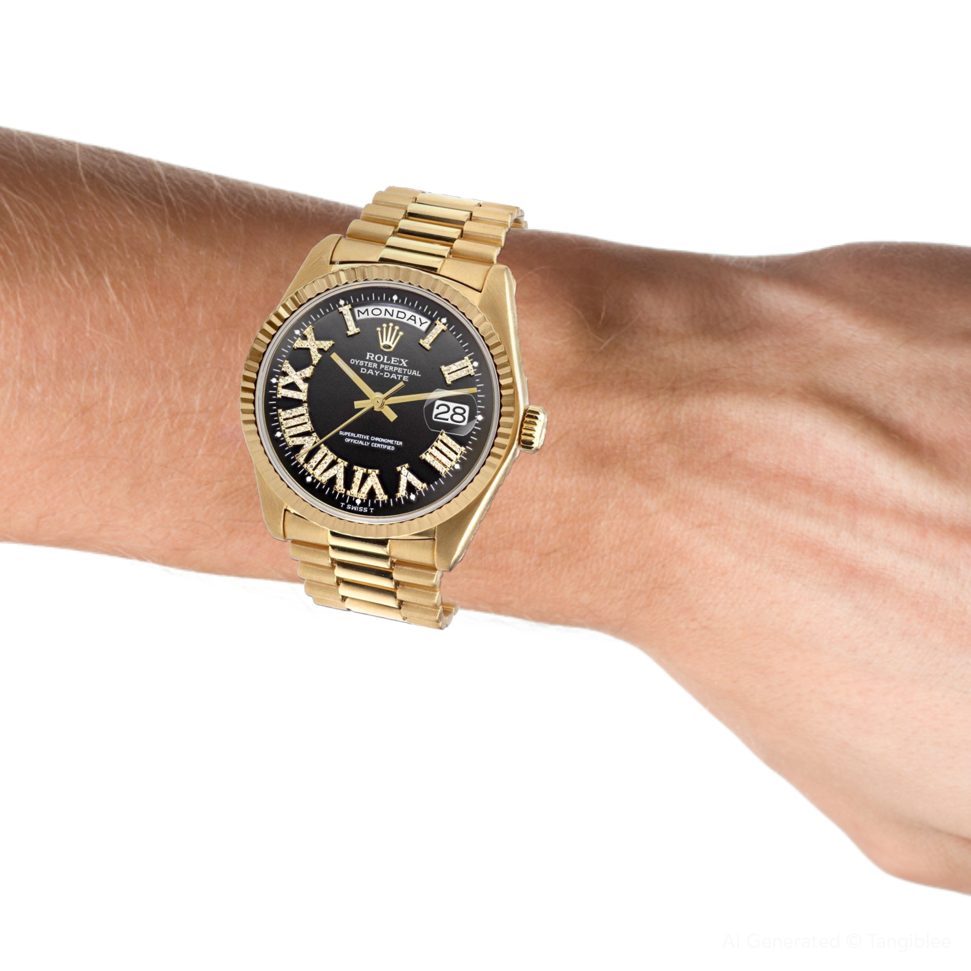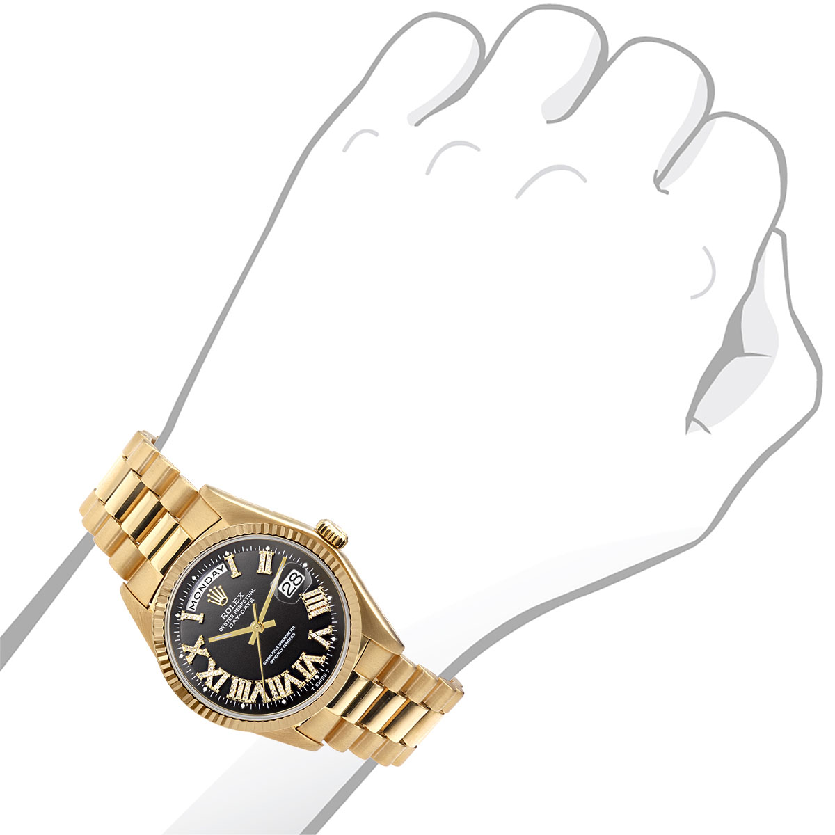 This Men's Rolex Day-Date is a luxurious and stylish watch. It features a Yellow color scheme, adding sophistication to its design. The watch is made of 18k Gold, offering a premium feel. The case measures 36 mm. The case is crafted from 18k Gold. The bracelet is made of Yellow Gold It features a President style bracelet for a comfortable fit. The bezel is made of Yellow Gold. The dial is Black, enhancing its visual appeal. Powered by an Automatic movement, the watch includes functions such as Date Indicator. Offered in Very Good condition, and comes with a seller's warranty of 60 months. Also available on custom order with additional options. These pre-owned Rolex watches are authentic Rolex watches with genuine diamonds, in excellent condition, they are checked for authenticity and basic water resistance. Watches will withstand an occasional rain just fine, but they are not diver's watches and should not be worn in shower or while swimming.