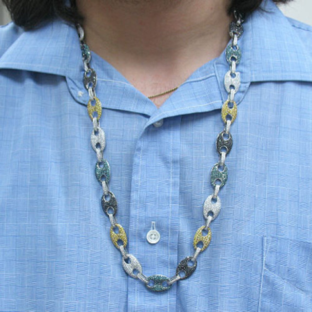 This Men's Diamond Chain is made from 14k with a link type and fitting. This Chain measures inches in length and 8 mm in width. It features 29 carats of color diamonds with clarity and a design. It is also available in 14k white gold, yellow gold and rose gold as well as 18k gold and platinum as a custom order.