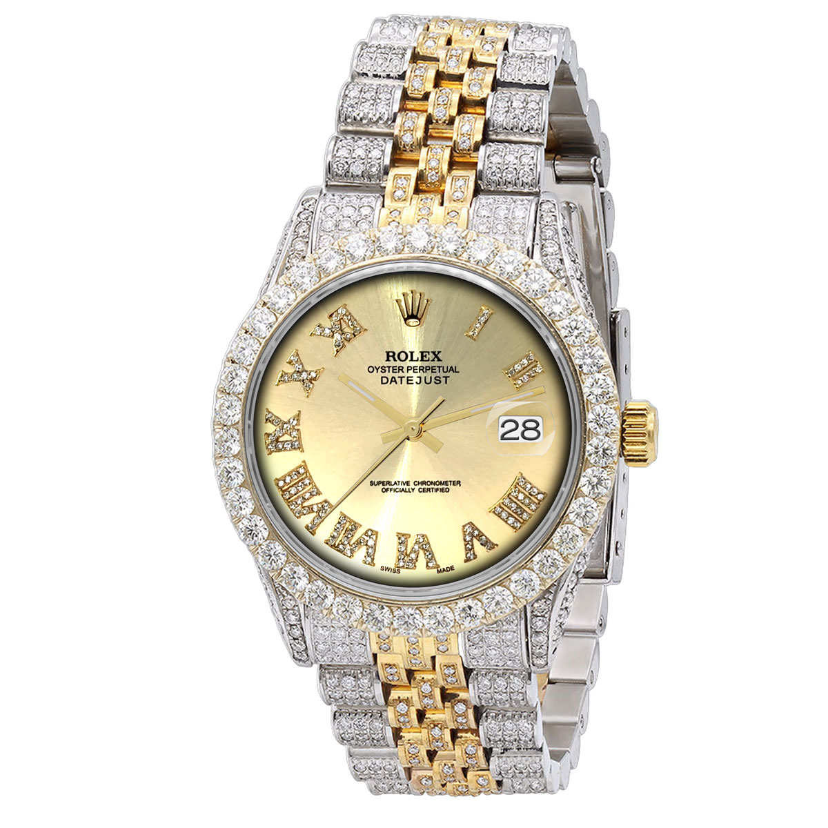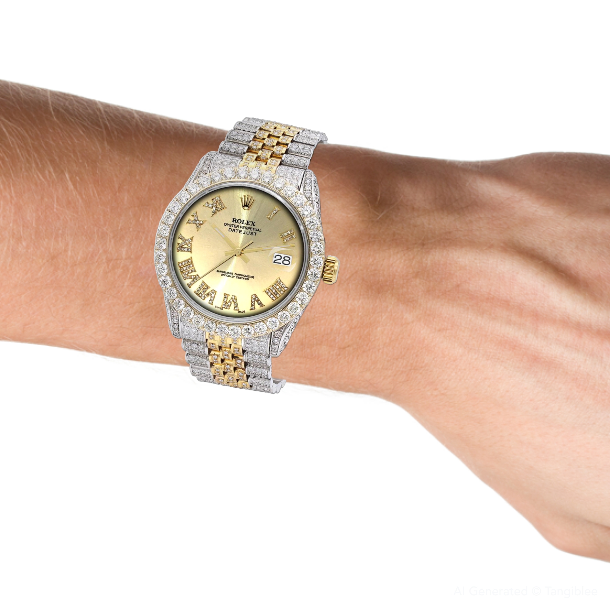 This Men's Bust Down Rolex Datejust is a luxurious and stylish watch. It features a White/Yellow color scheme, adding sophistication to its design. The watch is made of Gold/Stainless Steel, offering a premium feel. The case measures 36 mm. The case is adorned with White Diamonds, enhancing its elegance. The bracelet is made of Stainless Steel It features a Jubilee style bracelet for a comfortable fit. The bezel is made of Yellow Gold and is set with White Diamonds. The dial is Gold Tone, enhancing its visual appeal. Powered by an Automatic movement, the watch includes functions such as Date Indicator. Offered in Very Good condition, and comes with a seller's warranty of 60 months. Also available on custom order with additional options. These pre-owned Rolex watches are authentic Rolex watches with genuine diamonds, in excellent condition, they are checked for authenticity and basic water resistance. Watches will withstand an occasional rain just fine, but they are not diver's watches and should not be worn in shower or while swimming.