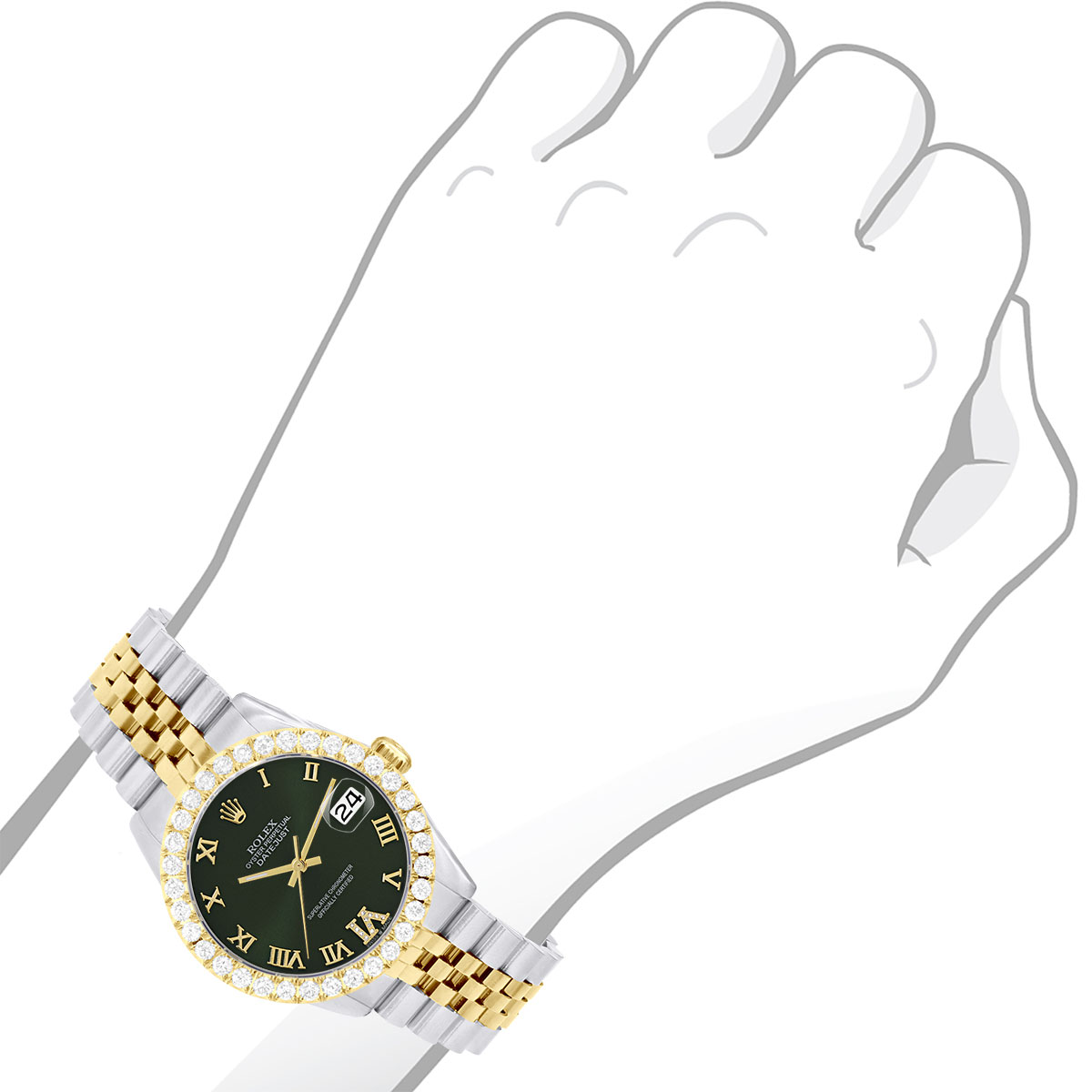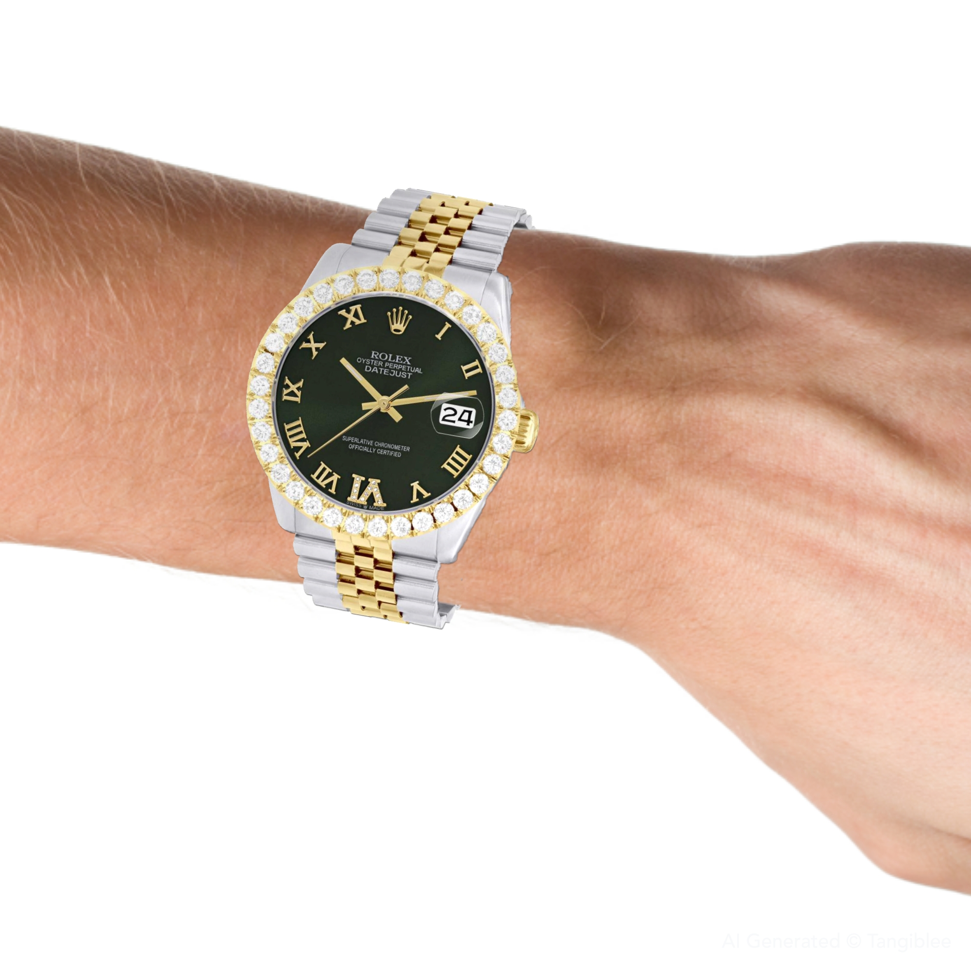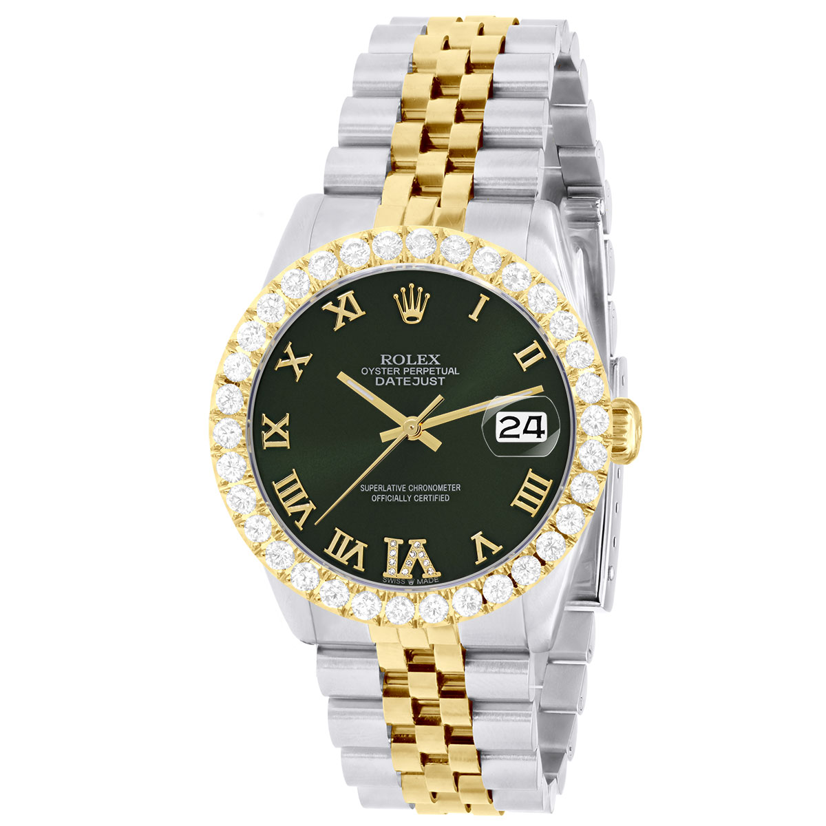 This Men's Two-Tone Rolex Datejust is a luxurious and stylish watch. It features a White/Yellow color scheme, adding sophistication to its design. The watch is made of Gold/Stainless Steel, offering a premium feel. The case measures 36 mm. The bracelet is made of Stainless Steel It features a Jubilee style bracelet for a comfortable fit. The bezel is made of Yellow Gold and is set with White Diamonds. The dial is Dark Green, enhancing its visual appeal. Powered by an Automatic movement, the watch includes functions such as Date Indicator. Offered in Very Good condition, and comes with a seller's warranty of 60 months. Also available on custom order with additional options. These pre-owned Rolex watches are authentic Rolex watches with genuine diamonds, in excellent condition, they are checked for authenticity and basic water resistance. Watches will withstand an occasional rain just fine, but they are not diver's watches and should not be worn in shower or while swimming.
