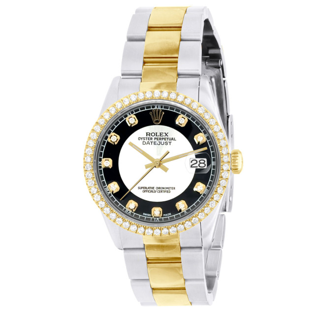 This Men's Two-Tone Rolex Datejust is a luxurious and stylish watch. The watch is made of Gold/Stainless Steel, offering a premium feel. The case measures 36 mm. The bracelet is made of Yellow Gold It features an Oyster style bracelet for a comfortable fit. The bezel is made of Yellow Gold and is set with White Diamonds. enhancing its visual appeal. Powered by an Automatic movement. Offered in Good condition, and comes with a seller's warranty of 60 months. Also available on custom order with additional options. These pre-owned Rolex watches are authentic Rolex watches with genuine diamonds, in excellent condition, they are checked for authenticity and basic water resistance. Watches will withstand an occasional rain just fine, but they are not diver's watches and should not be worn in shower or while swimming.