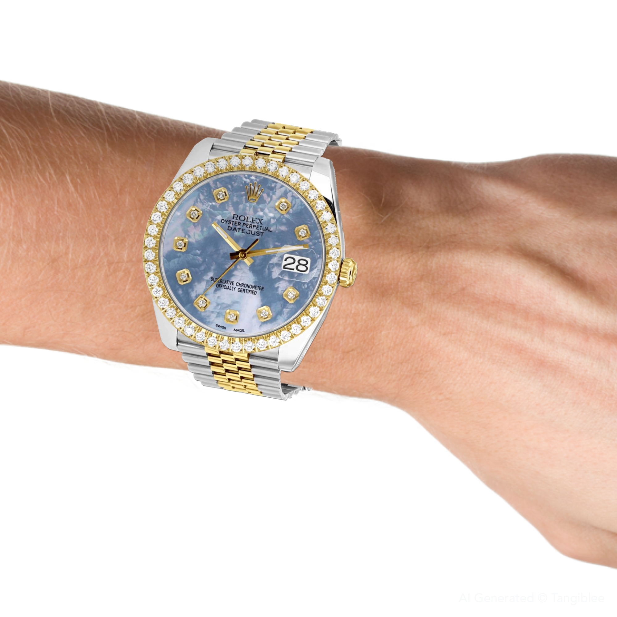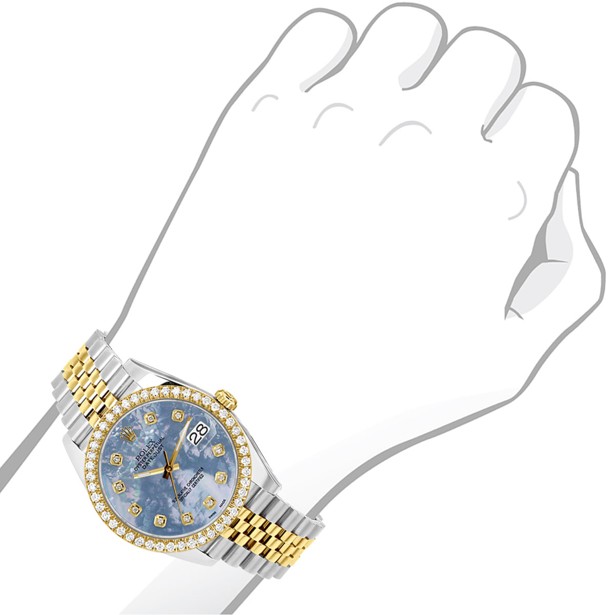 This Men's Two-Tone Rolex Datejust is a luxurious and stylish watch. It features a White/Yellow color scheme, adding sophistication to its design. The watch is made of Gold/Stainless Steel, offering a premium feel. The case measures 41 mm. The bracelet is made of Stainless Steel It features a Jubilee style bracelet for a comfortable fit. The bezel is made of Yellow Gold and is set with White Diamonds. The dial is Blue, enhancing its visual appeal. Powered by an Automatic movement, the watch includes functions such as Date Indicator. Offered in Very Good condition, and comes with a seller's warranty of 60 months. Also available on custom order with additional options. These pre-owned Rolex watches are authentic Rolex watches with genuine diamonds, in excellent condition, they are checked for authenticity and basic water resistance. Watches will withstand an occasional rain just fine, but they are not diver's watches and should not be worn in shower or while swimming.