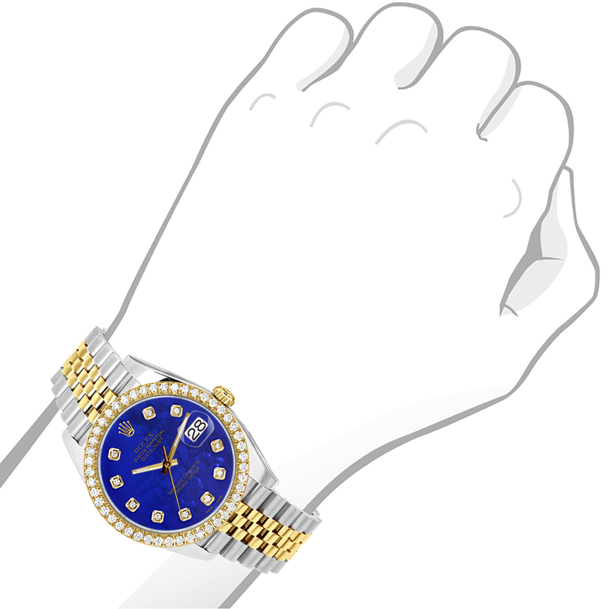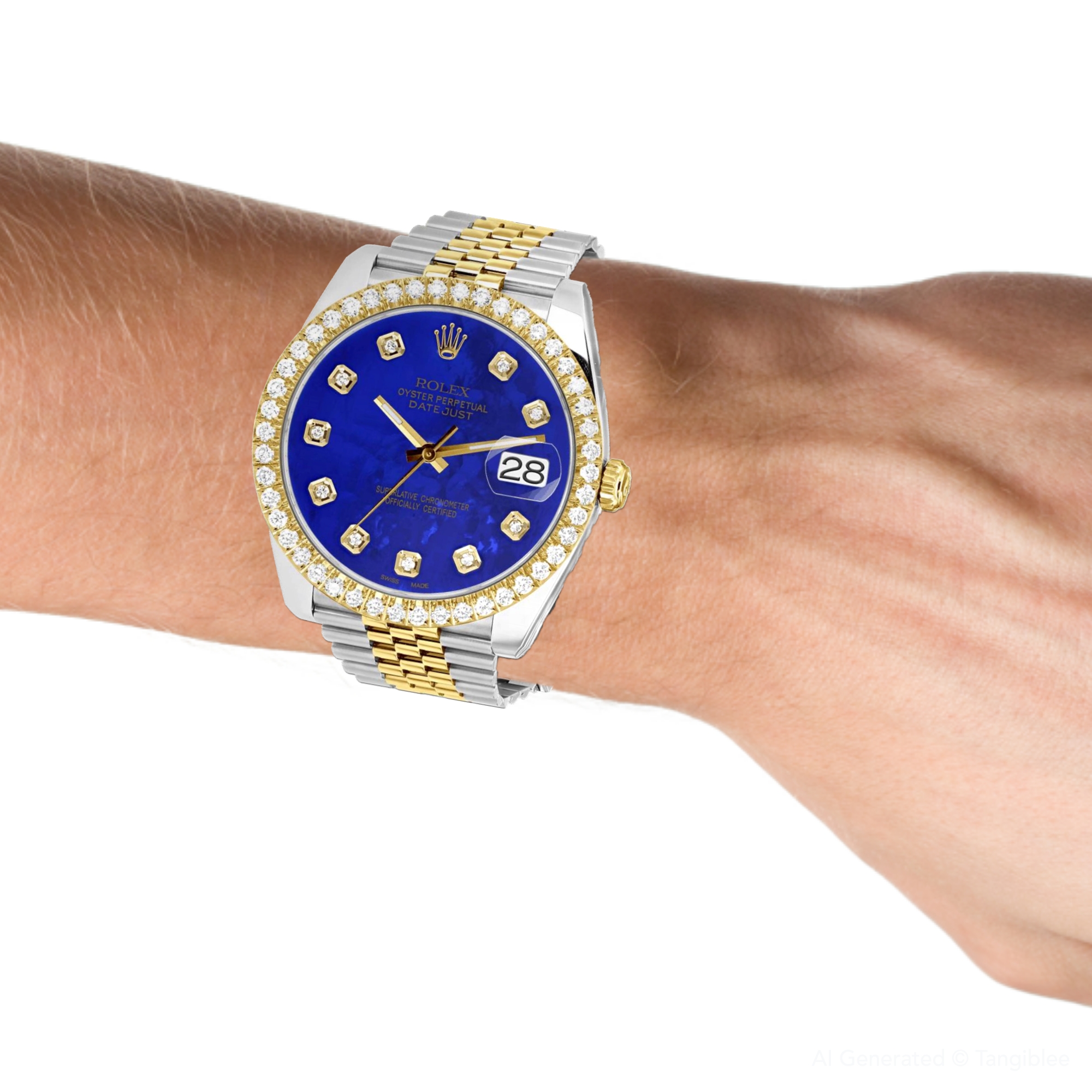 This Men's Two-Tone Rolex Datejust is a luxurious and stylish watch. It features a White/Yellow color scheme, adding sophistication to its design. The watch is made of Gold/Stainless Steel, offering a premium feel. The case measures 41 mm. The bracelet is made of Stainless Steel It features a Jubilee style bracelet for a comfortable fit. The bezel is made of Yellow Gold and is set with White Diamonds. The dial is Blue, enhancing its visual appeal. Powered by an Automatic movement, the watch includes functions such as Date Indicator. Offered in Very Good condition, and comes with a seller's warranty of 60 months. Also available on custom order with additional options. These pre-owned Rolex watches are authentic Rolex watches with genuine diamonds, in excellent condition, they are checked for authenticity and basic water resistance. Watches will withstand an occasional rain just fine, but they are not diver's watches and should not be worn in shower or while swimming.
