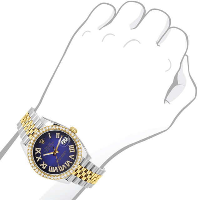 This Men's Two-Tone Rolex Datejust is a luxurious and stylish watch. It features a White/Yellow color scheme, adding sophistication to its design. The watch is made of Gold/Stainless Steel, offering a premium feel. The case measures 41 mm. The bracelet is made of Stainless Steel It features a Jubilee style bracelet for a comfortable fit. The bezel is made of Yellow Gold and is set with White Diamonds. The dial is Dark Blue, enhancing its visual appeal. Powered by an Automatic movement, the watch includes functions such as Date Indicator. Offered in Very Good condition, and comes with a seller's warranty of 60 months. Also available on custom order with additional options. These pre-owned Rolex watches are authentic Rolex watches with genuine diamonds, in excellent condition, they are checked for authenticity and basic water resistance. Watches will withstand an occasional rain just fine, but they are not diver's watches and should not be worn in shower or while swimming.