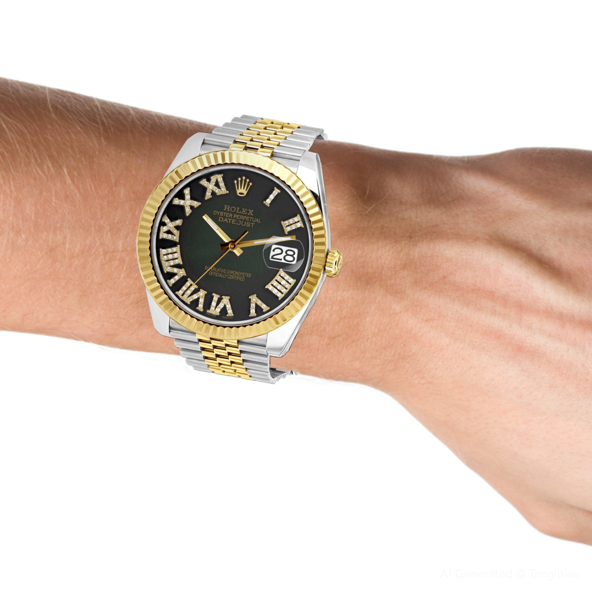 This Men's Two-Tone Rolex Datejust is a luxurious and stylish watch. It features a White/Yellow color scheme, adding sophistication to its design. The watch is made of Gold/Stainless Steel, offering a premium feel. The case measures 41 mm. The bracelet is made of Stainless Steel It features a Jubilee style bracelet for a comfortable fit. The bezel is made of Yellow Gold. The dial is Dark Green, enhancing its visual appeal. Powered by an Automatic movement, the watch includes functions such as Date Indicator. Offered in Very Good condition, and comes with a seller's warranty of 60 months. Also available on custom order with additional options. These pre-owned Rolex watches are authentic Rolex watches with genuine diamonds, in excellent condition, they are checked for authenticity and basic water resistance. Watches will withstand an occasional rain just fine, but they are not diver's watches and should not be worn in shower or while swimming.